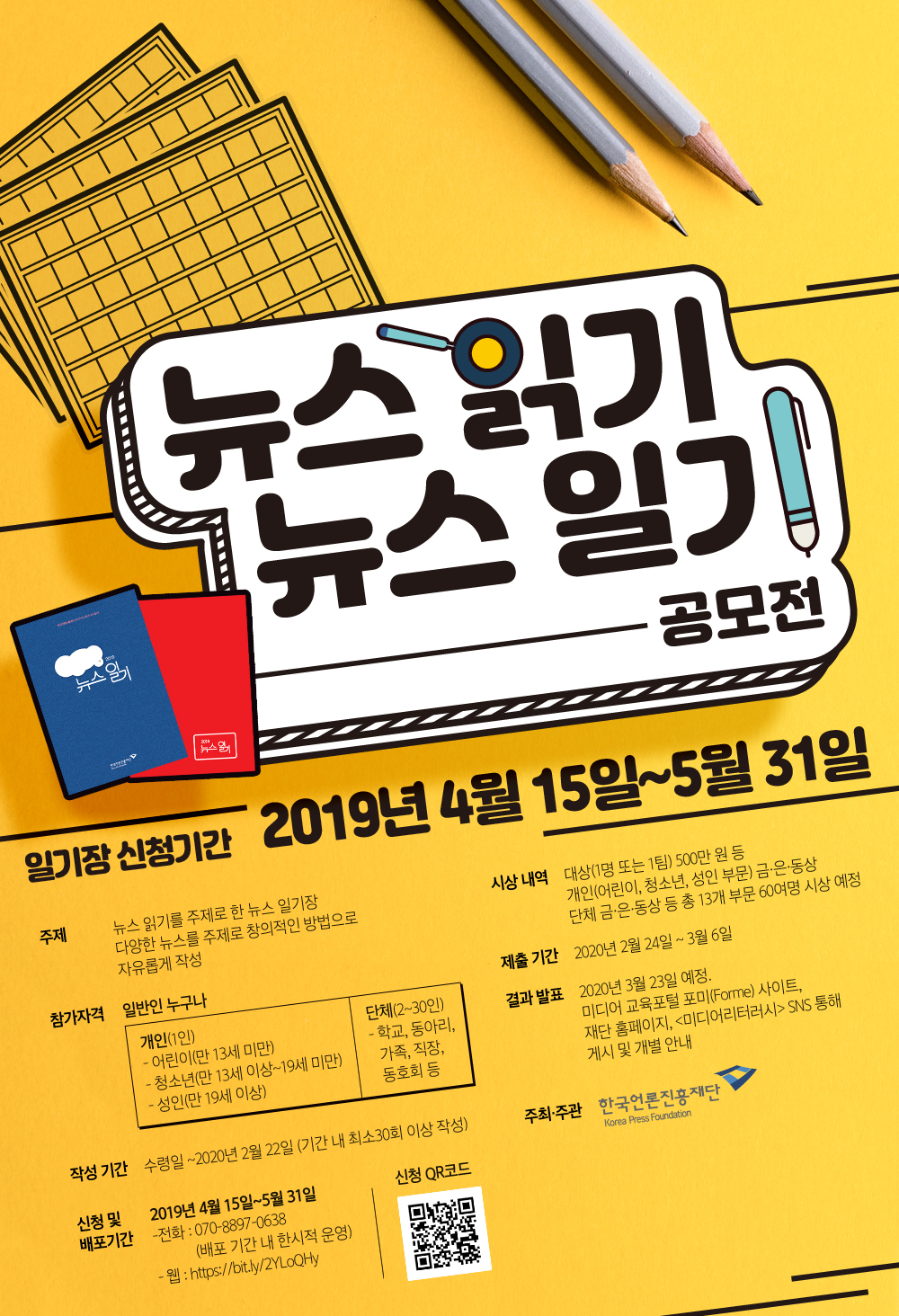 한국언론진흥재단은 국민들에게 뉴스의 분별력 있는 이용과 책임 있는 활용, 올바른 뉴스 이용 습관의 중요성을 알리기 위해 <뉴스 읽기, 뉴스 일기> 캠페인을 진행합니다. ‘뉴스 읽기를 주제로 한 뉴스 일기장’을 배포하고 공모전을 개최하여 최대 500만원(대상, 1명 또는 1팀) 상당의 상금과 상패를 수여할 예정입니다.
