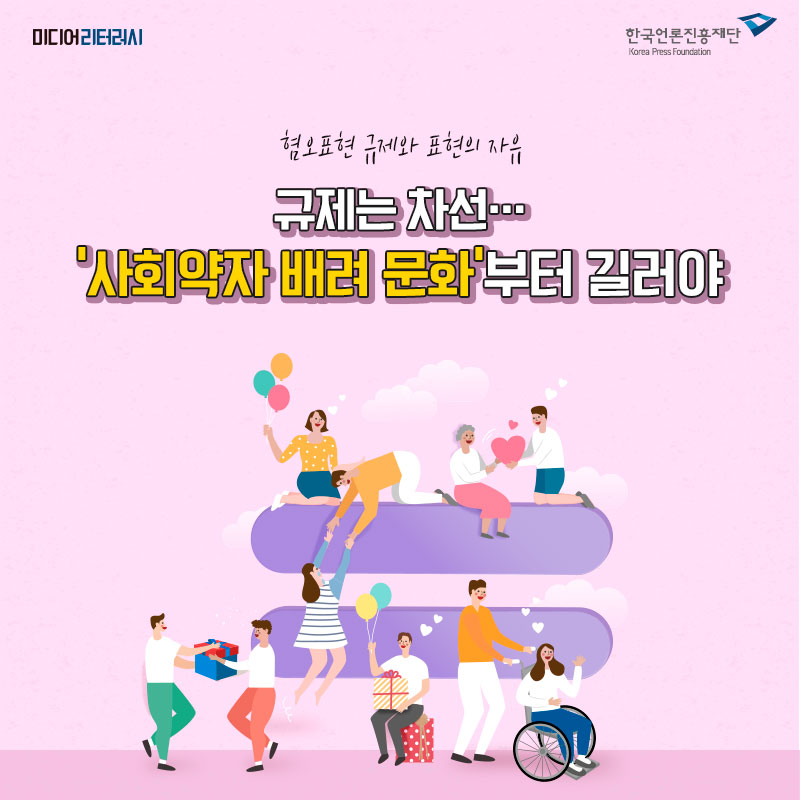아울러 미디어에서 혹은 인터넷에서 무심코 사용되는 혐오표현 사례에 대한 조사 및 점검, SNS 상에서 혐오표현에 노출됐을 때 어떻게 대처하면 좋을지에 대한 교육이 병행되는 것이 바람직할 것이라 본다. 또한 필자는 혐오표현 규제, 특히 온라인 혐오표현 규제는, 디지털 미디어 리터러시 교육의 궁극적 목적으로 꼽히는 디지털 시민성의 함양 없이는 결코 성공할 수 없으리라 생각한다. 나와 타인의 관계에 대한 이해, 나와 다른 정체성을 가진 타자에 대한 존중과 수용, 사회적 약자에 대한 공감과 배려를 우리 사회의 주요 가치와 문화로 정착시켜 나가는 노력을 미디어 업계와 교육계가 꾸준히 해야 하는 이유다.