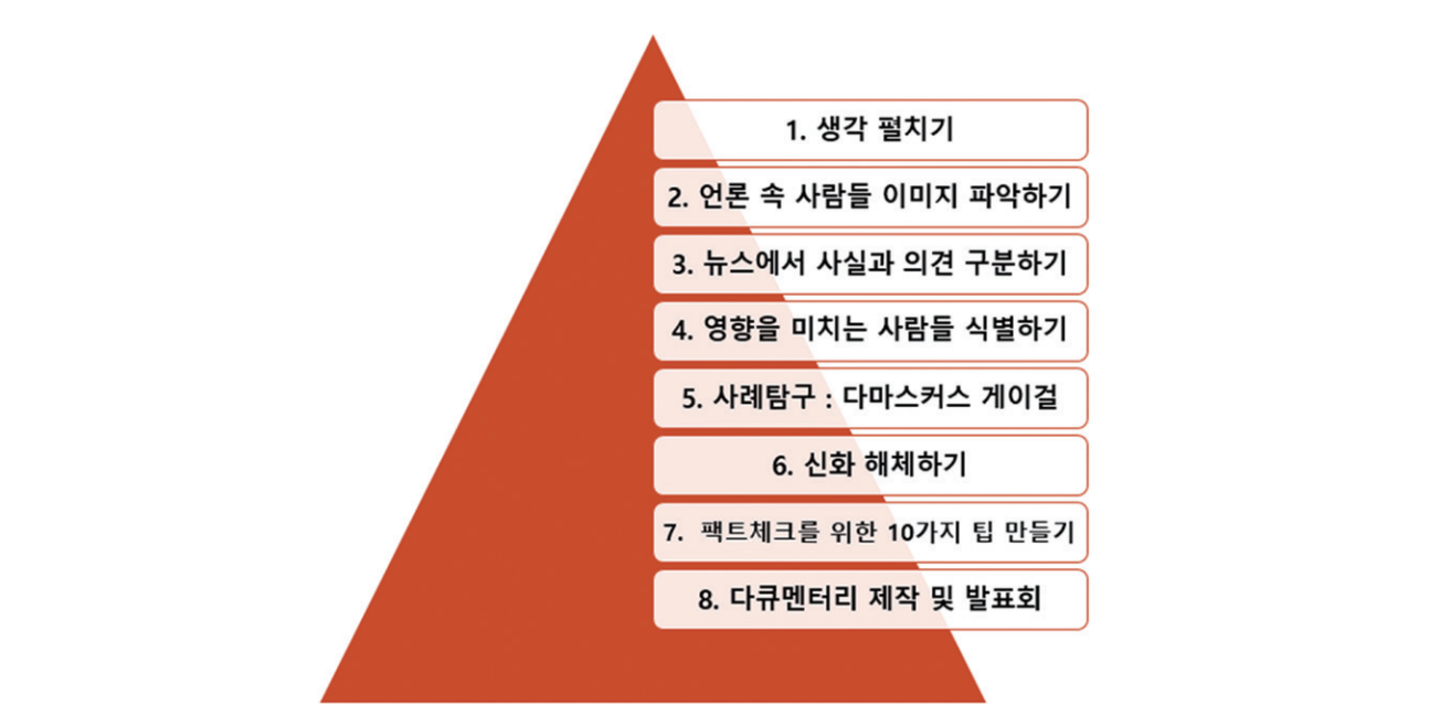 학생들에게 모둠별로 뉴스에서 사실 여부를 확인하고, 정보원의 신뢰도를 파악할 수 있는 10가지 팁을 만들어보도록 했다. 그리고 그것을 지도교사가 만든 10가지 팁과 비교하고 토론하는 시간을 가졌다.