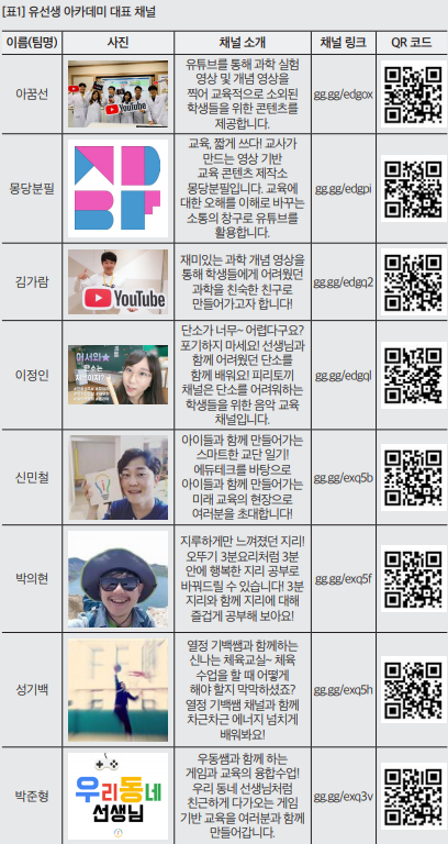 저의 경우에는 ‘스마트한 교단 일기’를 주제로 학교 수업에 초점을 맞춰 영상을 제작하고 있습니다. 수업 시간에 카메라와 스마트폰을 활용해 학생들의 활동 장면을 촬영한 뒤 일과 후에 개인 시간을 내어 편집도 하고 유튜브에 업로드도 합니다. 사실 하나의 영상을 만들기 위해 많은 시간과 노력이 들어갑니다. 하지만 영상을 완성해 아이들과 공유했을 때 아이들이 유튜브에 나온 자신의 모습에 행복해 하는 모습을 보는 것이 너무나도 좋기에 포기할 수 없습니다. 이처럼 많은 쌤튜버들은 각기 자신만의 이유를 찾아나가며 학생들을 위한 유튜브 채널을 운영하고 있습니다.
