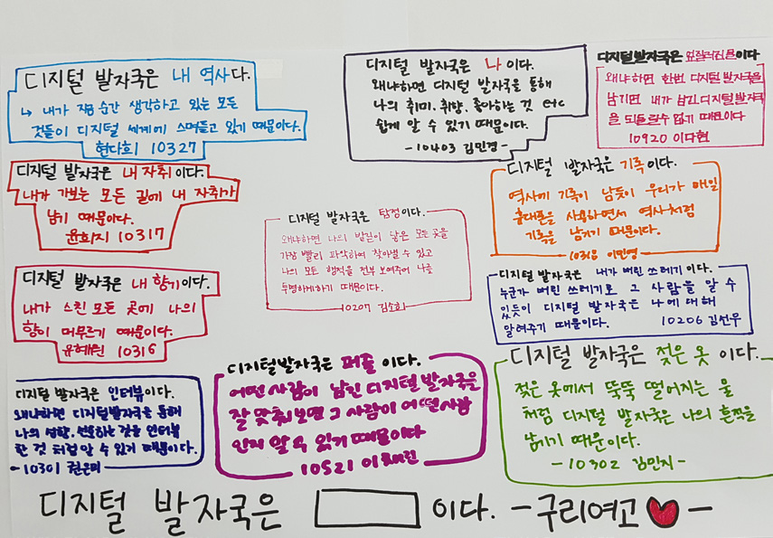 ①과연 빅데이터는 빅브라더(정보 독점으로 사용자를 관리, 감독, 통제하는 힘)가 될까요? 함께 생각해봤습니다. 고은이는 ‘디지털 발자국을 따라 빅브라더가 쫒아온다’며 디지털 발자국의 순기능과 역기능을 글로 표현했습니다[사진9].