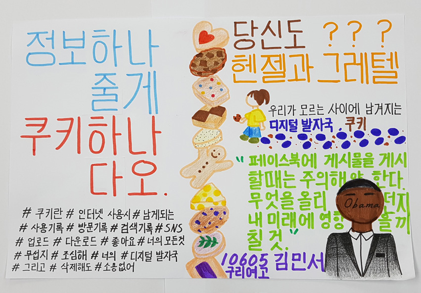 학생들은 ‘쿠키’라는 말은 들어보긴 했지만 ‘쿠키’에 이렇게 많은 내 정보가 담기는지 몰랐다며 충격을 받았다고 말했습니다. 먼저 쿠키가 무엇인지 모르는 초등학교 쿠.알.못 동생들에게 쿠키에 대해 설명해 주는 자료를 만들었습니다. 동생들에게 안내하는 자료여서인지 《헨젤과 그레텔》, 《누가 내 머리에 똥 쌌어?》 등 잘 알려진 동화나 그림책에서 아이디어를 빌려왔습니다. 내용도 ‘정보 하나줄게, 쿠키 하나 다오’, ‘두더지에게 쿠키를 흘린 범인은 바로 인터넷을 사용하는 너!’라는 식으로 아주 쉽게 표현했습니다. 학생들은 자료 만드는 활동을 통해 ‘쿠키’에 대해 더 정확하게 인식했고, 쿠키 정보는 동생뿐 아니라 친구에게도 꼭 전달하고 싶다고 말했습니다[사진7~8]