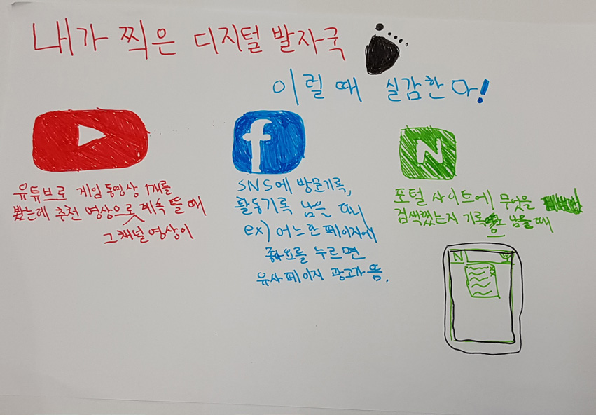 활발하게 SNS 활동을 하는 중학생들은 스스로 남긴 디지털 발자국이 수집된다는 사실에 긴장했습니다. 먼저 ‘요즘 내가 남긴 디지털 발자국이 무엇인지, 내 디지털 발자국이 나에 대한 어떤 정보를 제공하는지’ 생각했죠.