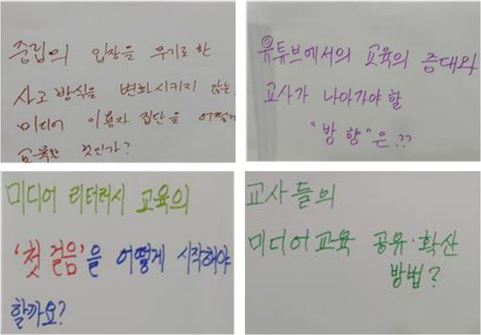 질문은 비록 네 개에 불과했지만 굉장히 많은 대답이 나왔고 ‘나’의 고민에 대한 답이 ‘우리’에게서 나온, 뜻깊은 시간이었다. 제한된 시간이 아쉬울 정도로 열띤 토론이 이어졌으며 선생님들의 고민과 해결책, 자료와 정보 나눔 등을 통해 미디어 리터러시 교육은 나 혼자가 아닌 함께 할 때 더 많은 유익함과 가치를 얻을 수 있음을 느낄 수 있었다.