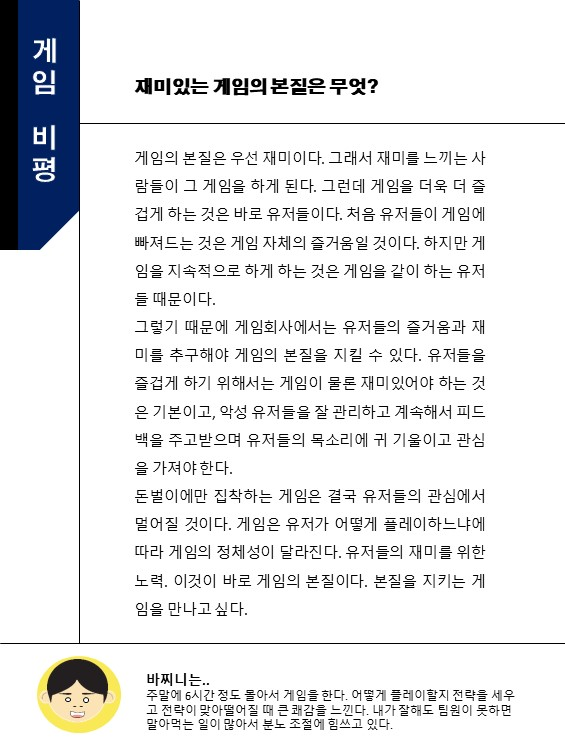 게임 리뷰가 게임에 대한 이해와 시야를 넓혀 주는 활동이라면 게임 문화 비평은 게임을 통해 인간과 사회를 이해하는 활동이다. 게임 중독, 욕설, 현질 등 게임과 관련된 다양한 이슈 중 하나를 골라 자신의 생각을 쓰도록 했다. 비평을 위해서는 게임 문화에 대해 진지하게 성찰하는 시간이 필요했다.