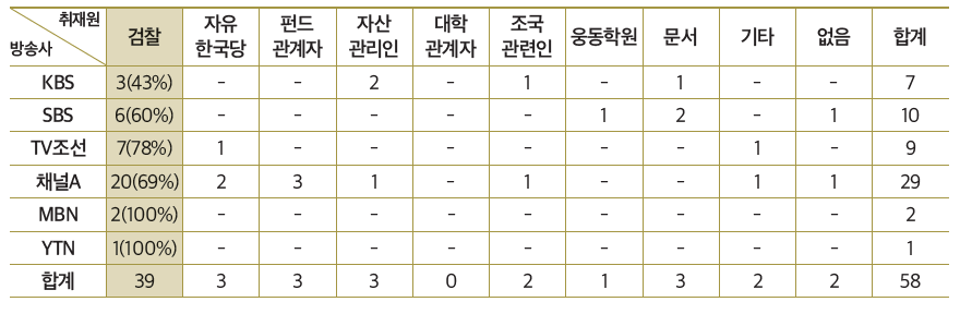 [표1] 6개 방송사 조국 의혹 ‘단독 보도’ 출처(9.10~9.24) 단위: 명
