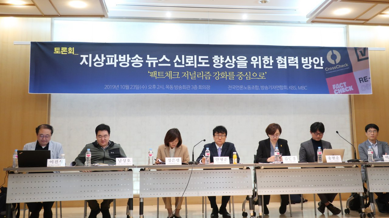 그래서입니다. ‘지상파 공동 팩트체크센터’를 제안하고 논의하고 있는 이유입니다. 우리 사회가 더욱 복잡해지고, 많은 정보가 생산되는 상황에서 언론의 기사 작성을 위한 ‘사실 확인’은 더욱 세밀해져야 하고, 단단해져야 합니다. 특히, 막강한 영향력을 가지고 있는 지상파는 더욱 책임감을 느껴야 하고 실천해야 합니다. 이런 취지로 전국언론노동조합과 방송기자연합회, KBS와 MBC가 지난 10월 23일 ‘지상파방송 뉴스 신뢰도 향상을 위한 협력 방안-팩트체크 저널리즘 강화를 중심으로’란 주제로 토론회를 개최했습니다.