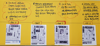 수업에 참여했던 윤순옥 선배시민은 즐거운 목소리로 말한다. “네이버에서 옛날 신문 자료를 찾아보는 재미가 쏠쏠하다. 이런 자료가 있다는 걸 처음 알았어요. 이래서 알아야 한다니까.” 그때 그 시절을 회고하며 목소리가 커지는 선배시민도 있었다. 황학진 선배시민은 “내가 입학시험 볼 때 서울1호선 지하철이 생겼어요. 지금도 기억이 생생한데…. 벌써 시간이 참 많이 흘렀네요!” 하며 추억의 뉴스들을 끊임없이 기억해냈다. 내가 태어날 때, 자녀가 태어날 때 등 뉴스를 비교하며 격세지감을 느낀다는 선배시민도 있었다. 올해 퇴임을 하고 친정어머니와 처음으로 긴 여행을 다녀왔다는 한 선배시민은 “2019년을 의미 있는 해로 잡고 2019년의 10대 뉴스를 만들어보겠다”는 의지도 보였다.