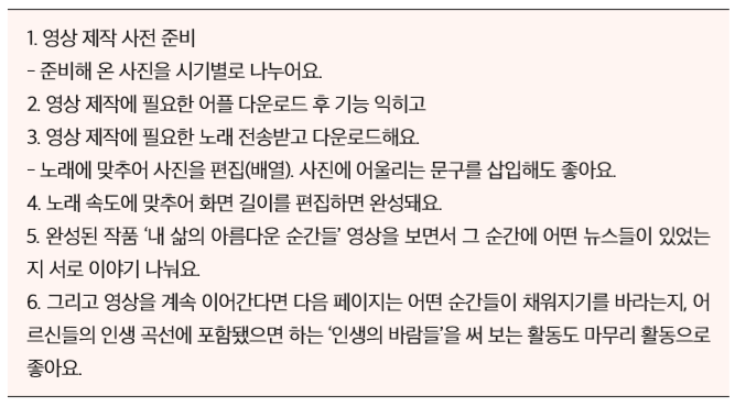 그렇게 내 인생의 뉴스는 영상으로도 탄생했다. 그 바탕이 된 뮤직비디오는 가수 왁스의 ‘황혼의 문턱’이다. 다함께 이 뮤직비디오를 감상한 뒤 서툴지만 영상 자서전 ‘황혼의 문턱’ 제작에 도전해 보기로 했다. 영상 제작 과정은 다음과 같다.