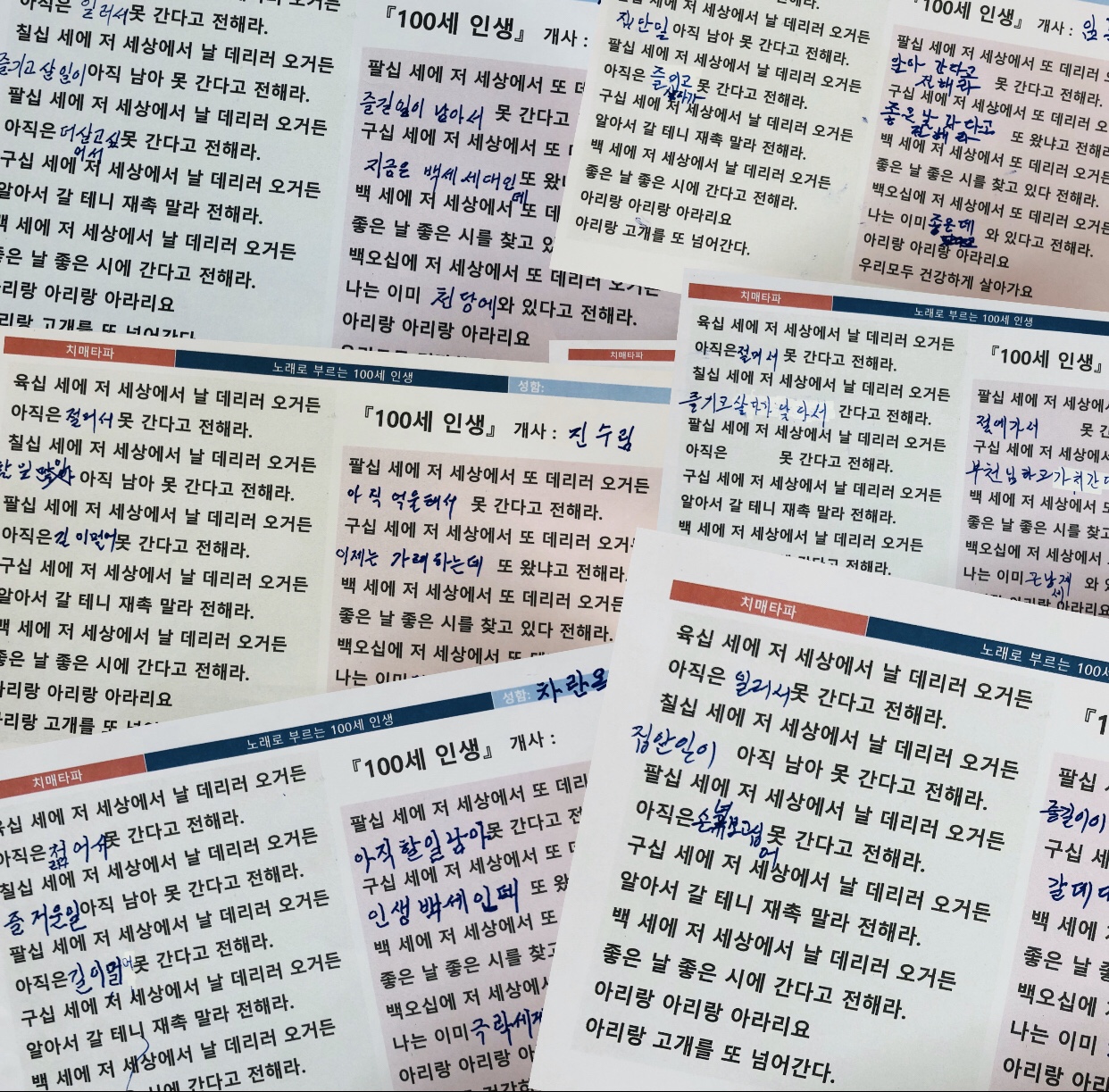 퀴즈에 이어서 노래 개사 활동을 했다. 개사할 노래는 ‘백세인생(노래 이애란)’이었다. 먼저 중간 중간에 빈칸이 있는 노래 가사를 배포한 뒤, 함께 백세인생 노래를 듣고 따라 부르기도 했다. 그리고 나서 가사의 빈칸을 어르신들의 이야기로 채우도록 했다. 다행히 모든 참가자가 글자를 쓸 줄 알아서 무난하게 활동을 진행할 수 있었다.