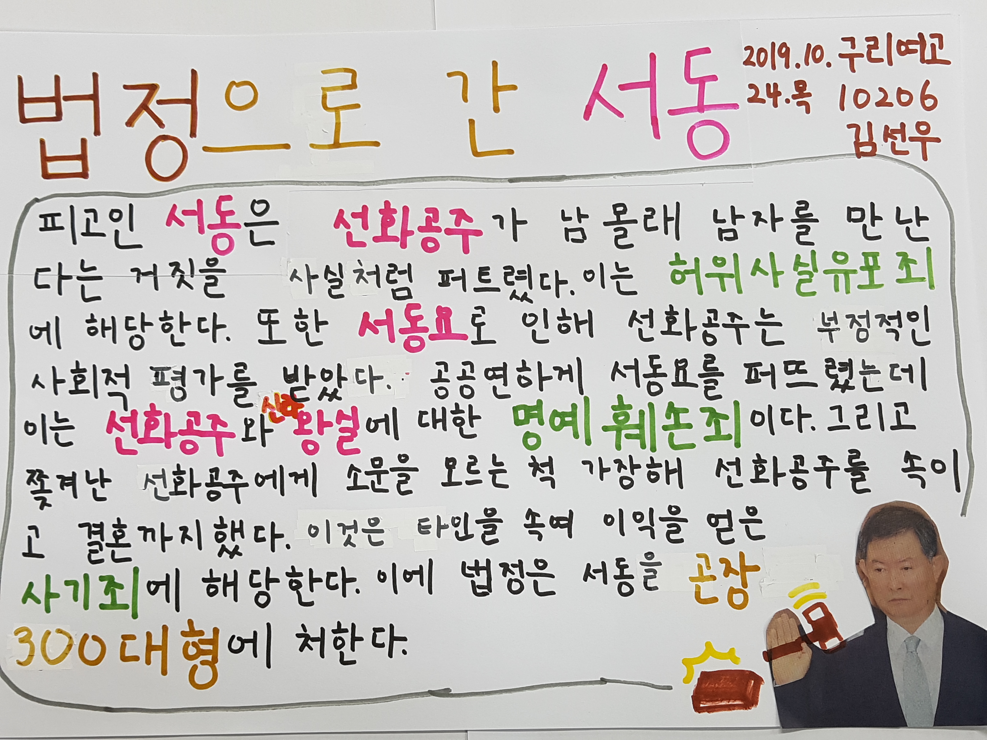 선우는 ‘서동에게 허위사실 유포죄, 명예훼손죄, 사기죄 등의 죄목으로 곤장형’을 선고했습니다.[사진1] 혜신이는 ‘사실의 진위 여부를 확인하지 않은 조정대신’들에게 선화공주 출궁의 책임을 물었습니다.[사진2] 서동요를 퍼뜨린 아이들에 대해서는 책임론과 동정론이 엇갈렸습니다. 수연이가 ‘맛있는 음식을 거부하기 어려운 나이라는 점을 감안해야 한다.’고 했지만, 지유는 ‘선화공주의 사회적 평가를 떨어뜨리는 명예훼손죄가 분명하므로 1000일 동안 매일 천자문 1번씩 쓰기’ 벌을 내렸습니다.