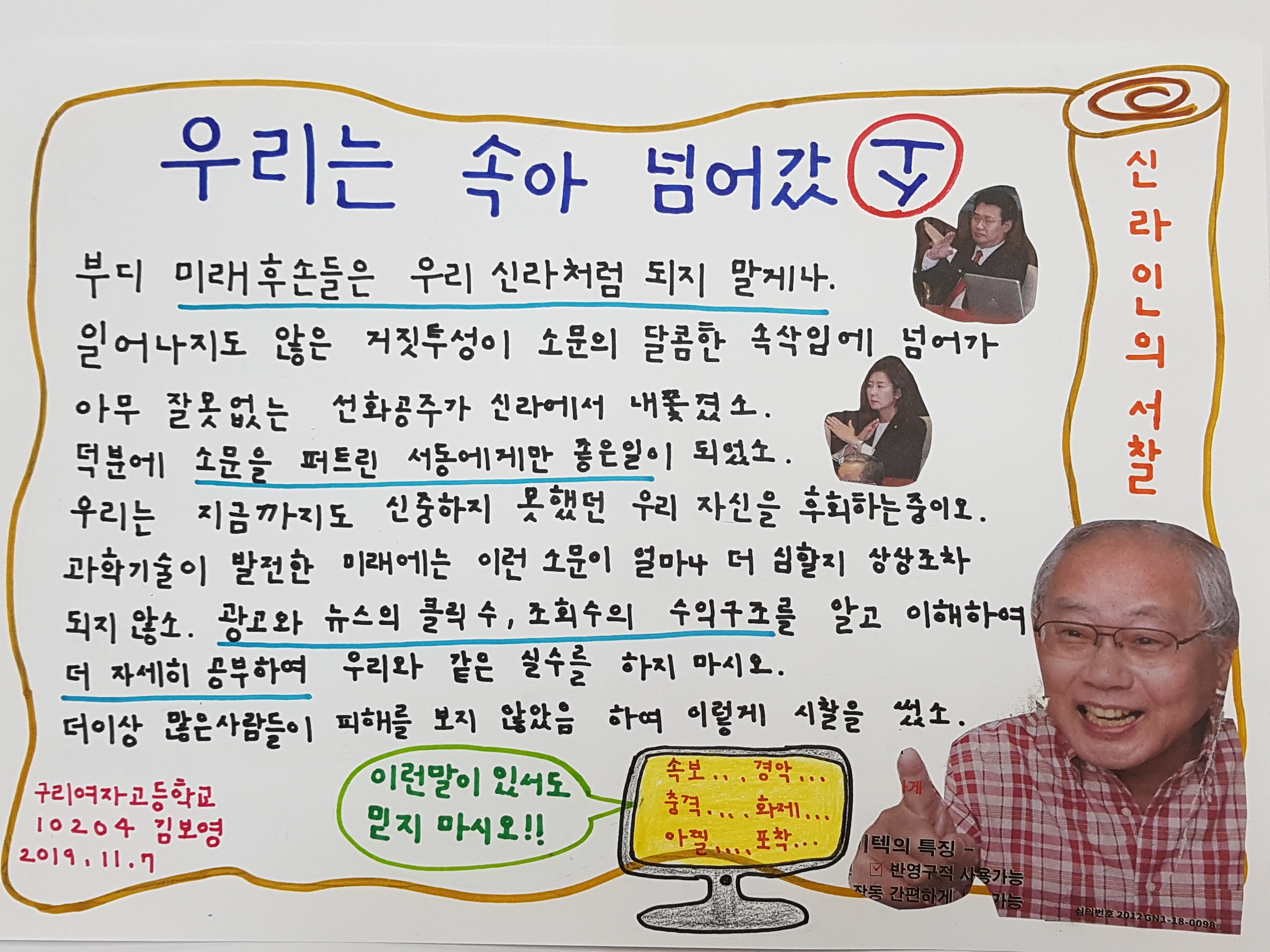 보영이는 “우리는 속아 넘어갔소”란 제목으로 ‘클릭수와 수익구조를 더 자세히 공부하여 우리와 같은 실수를 하지 말라’며 ‘충격, 아찔, 포착’ 등의 단어가 있어도 믿지 말라고 서찰을 썼습니다.[사진4]