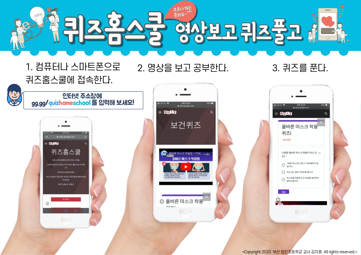 아이들의 집중력이 그리 길지 않은 것을 감안하여 5, 길어야 15분 정도의 영상이 적당하다고 생각을 했다. 그래서 영상으로 할 수 있으면서 교육적인 것, 퀴즈가 떠올랐다. 영상을 보고 퀴즈를 맞히는 것이다. 이름 하여 창진홈스쿨!2)