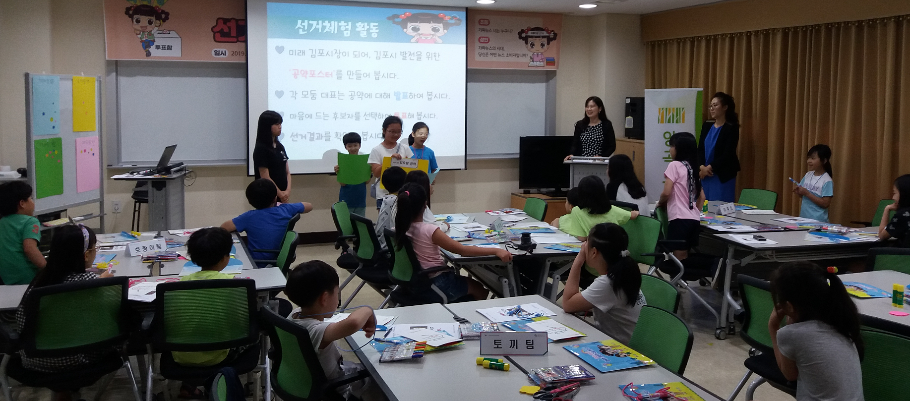 초등 대상 프로그램은 주로 국공립 도서관의 문화 체험 특강의 형태로 진행했다. 2시간이라는 비교적 짧은 시간 내에 선거제도의 기본적인 이해부터 다져가야 했기 때문에 투표 체험과 다양한 시청각 자료를 통해 흥미를 유발하고, 친숙하게 다가가려고 노력했다.