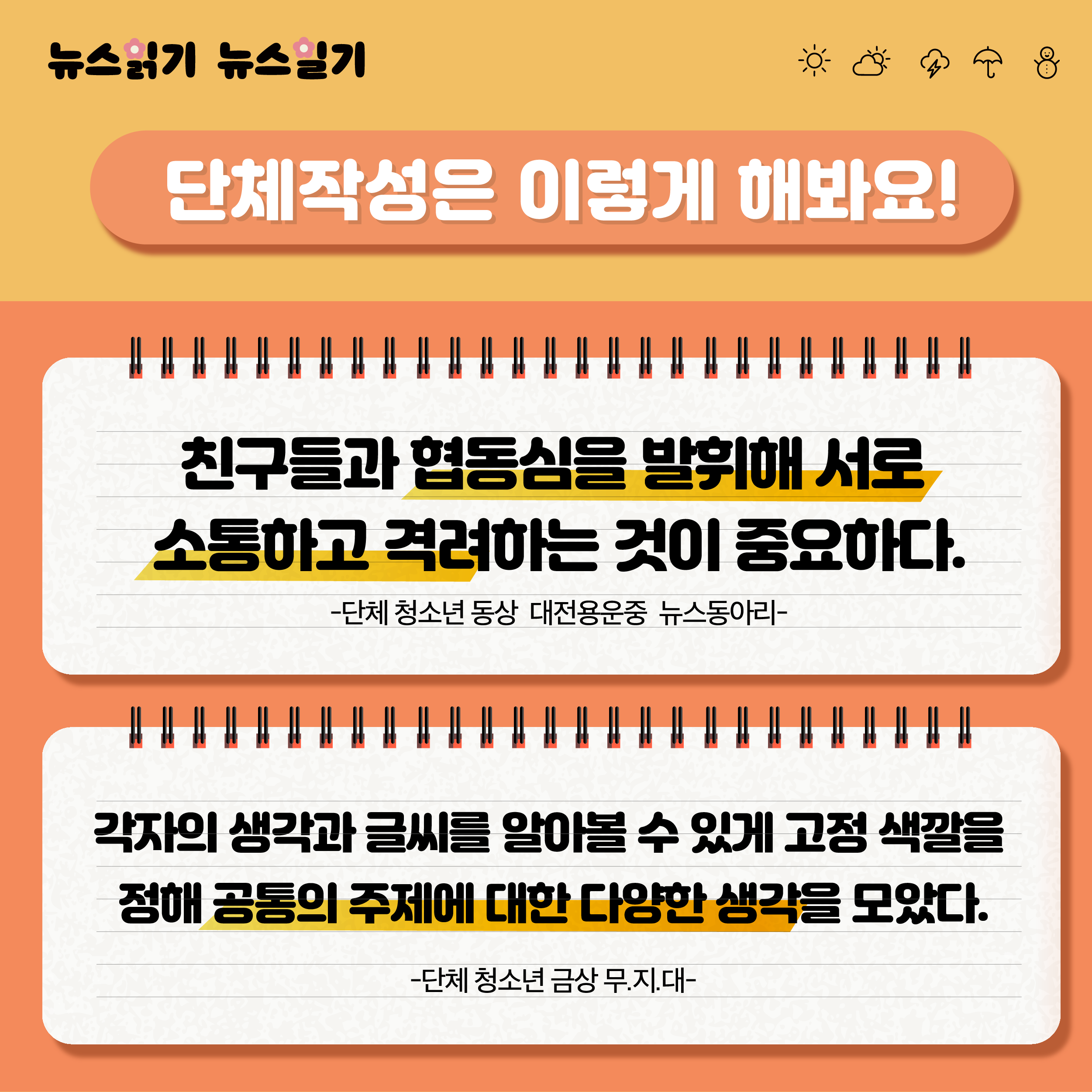 단체로 작성하는 경우, 공통 주제에 대해 여러 생각을 나눠볼 수 있다는 것이 가장 큰 장점입니다.