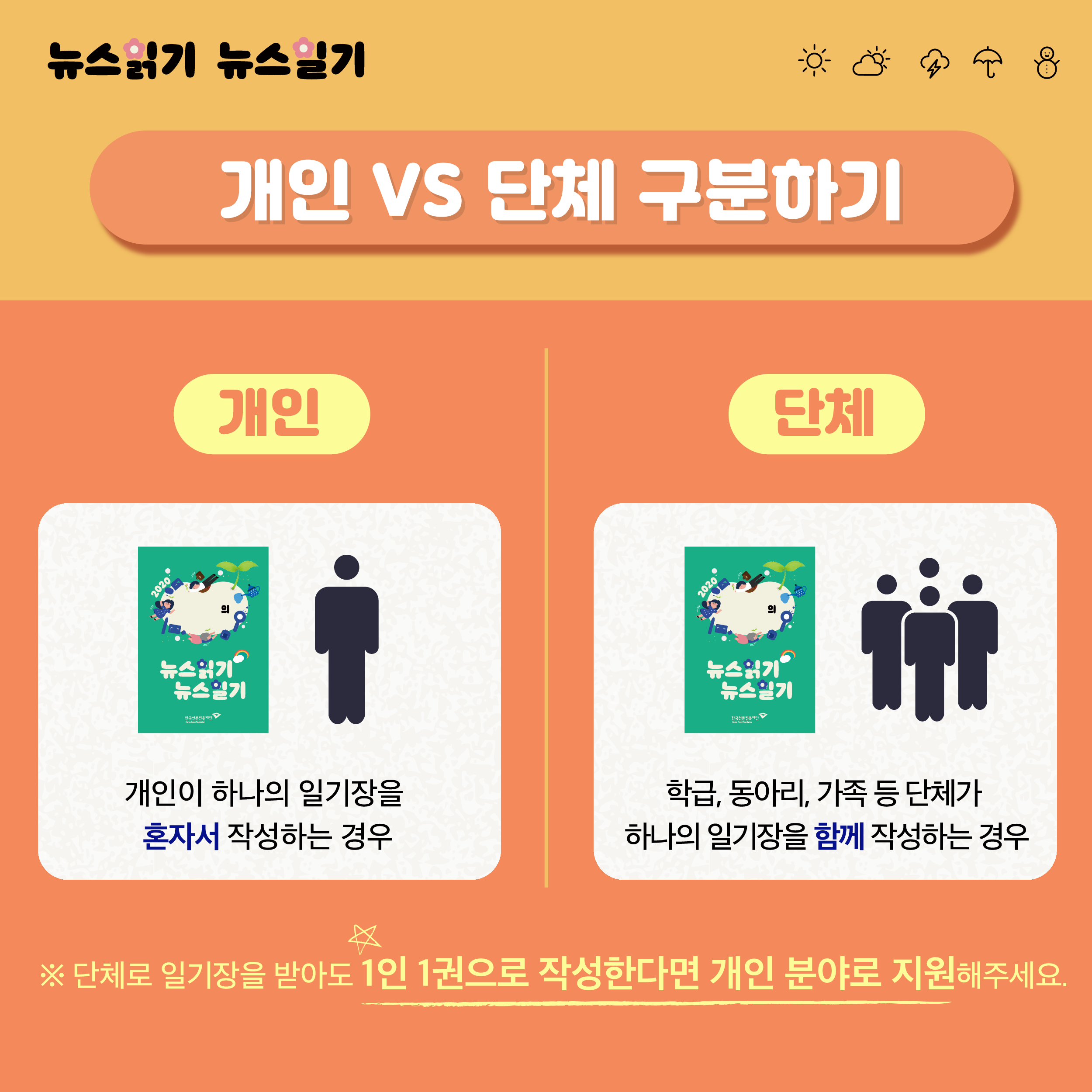 한 권의 일기장을 다 같이 작성한다면 단체 지원, 나만의 일기장을 각자 작성한다면 개인 지원입니다.