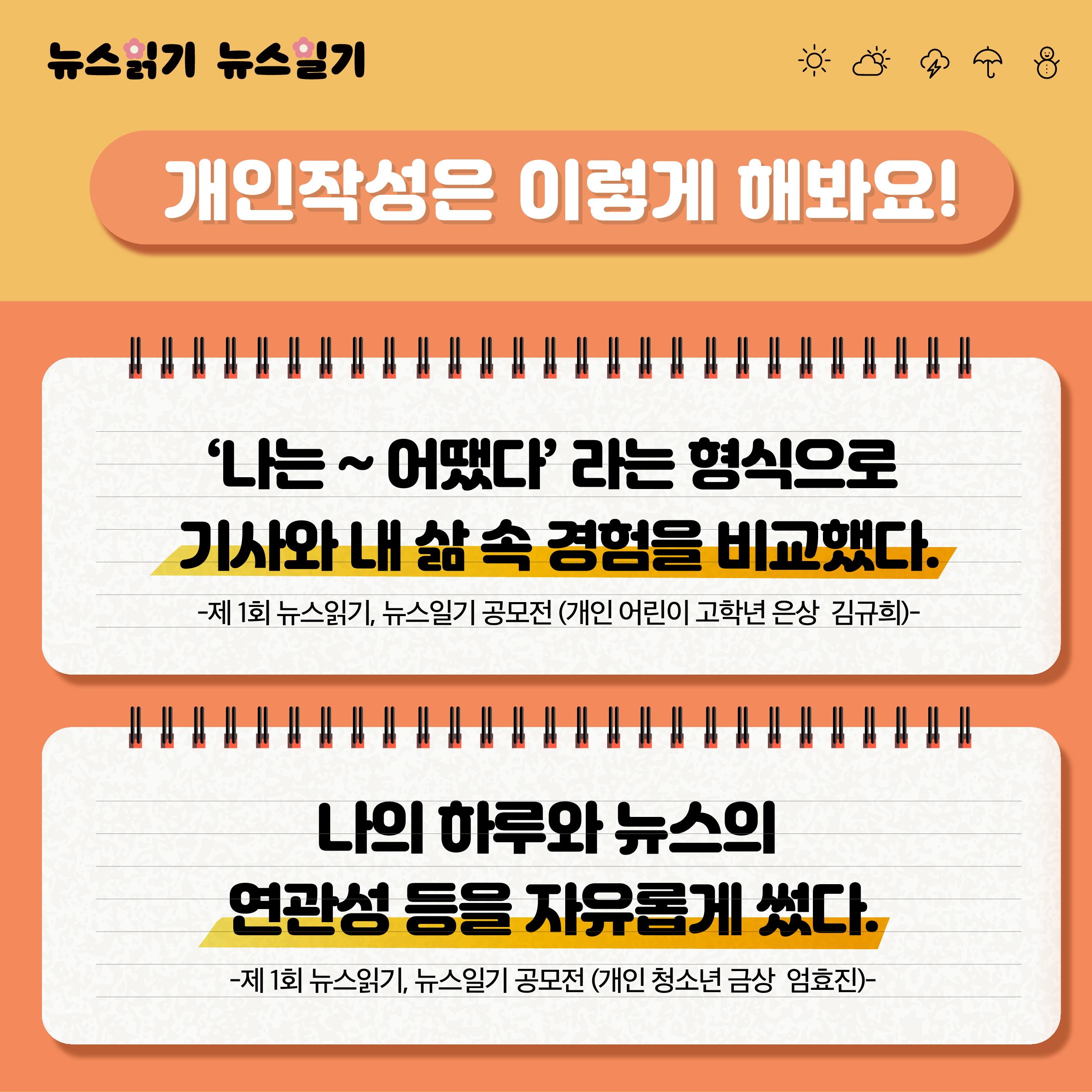 | 제2회 <뉴스읽기 뉴스일기> 제1회 수상자가 전하는 작성 꿀팁 대방출! - 어린이편- (0) | 2020.07.10 |