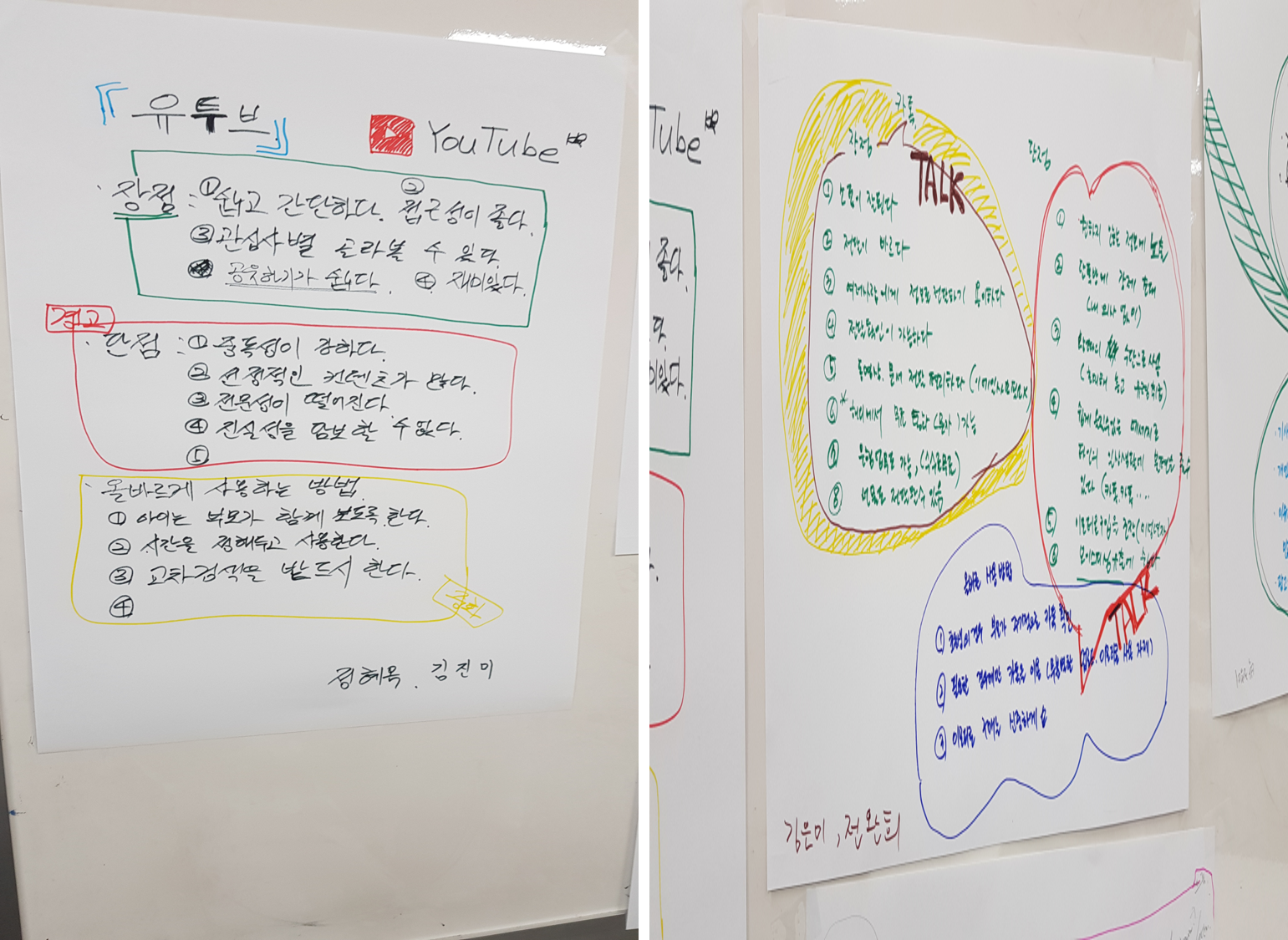 짝꿍과 내용 나누기를 하고, 서로 소개한 것 중 하나를 선택하게 했다. 미디어의 장점과 단점, 올바르게 사용하는 방법을 찾아보았다. 카톡을 선택한 팀에서는 장점으로 ‘소통이 잘된다’, ‘전달이 빠르다’, ‘은행 업무도 가능하다’를, 단점으로는 ‘원하지 않는 정보에 노출된다’, ‘내 의사와 상관없이 단톡방에 강제 초대된다’, ‘보이스피싱에 유출되기 쉽다’ 등을 꼽았다. 카톡을 올바르게 사용하기 위해서는 ‘필요한 경우에만 이용한다’, ‘사람들이 많은 곳에서는 무음으로 설정한다’, ‘잠자리에 들 때는 메시지를 확인하지 않는다’ 등의 의견이 나왔다.