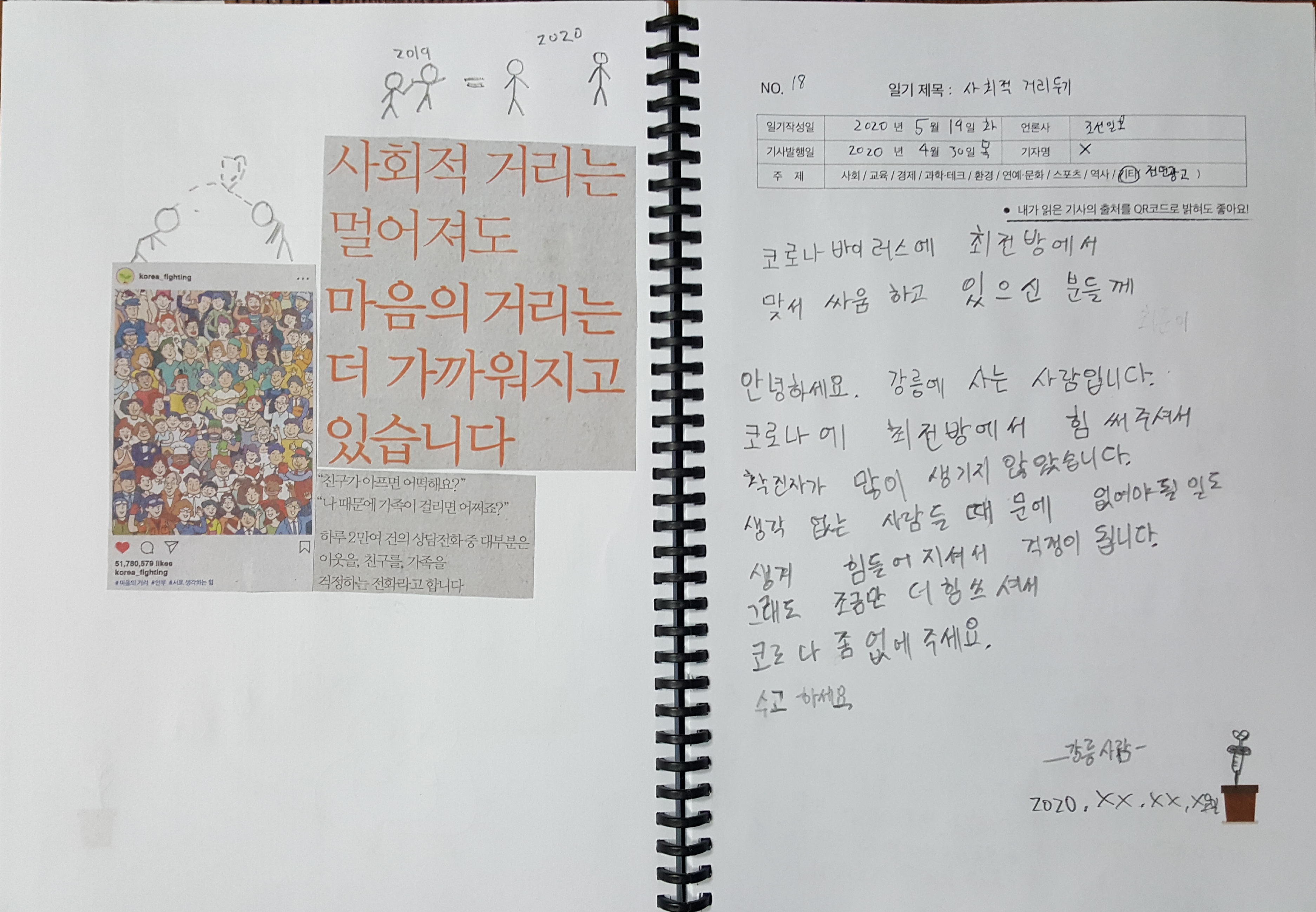 이 글을 쓰는데 반가운 전화가 한 통 왔다. 한국언론진흥재단에서 진행한 ‘제 1회 <뉴스읽기 뉴스일기> 공모전에서 아이가 상을 받았다는 기쁜 소식이다. “선생님 덕분에 좋은 기회를 얻어서 우리 아이들과 멋진 추억을 만들었어요. 작년에 이어 올해도 뉴스 일기장을 신청했어요. 다시 두 번째 멋진 추억을 만들어보려 합니다.”