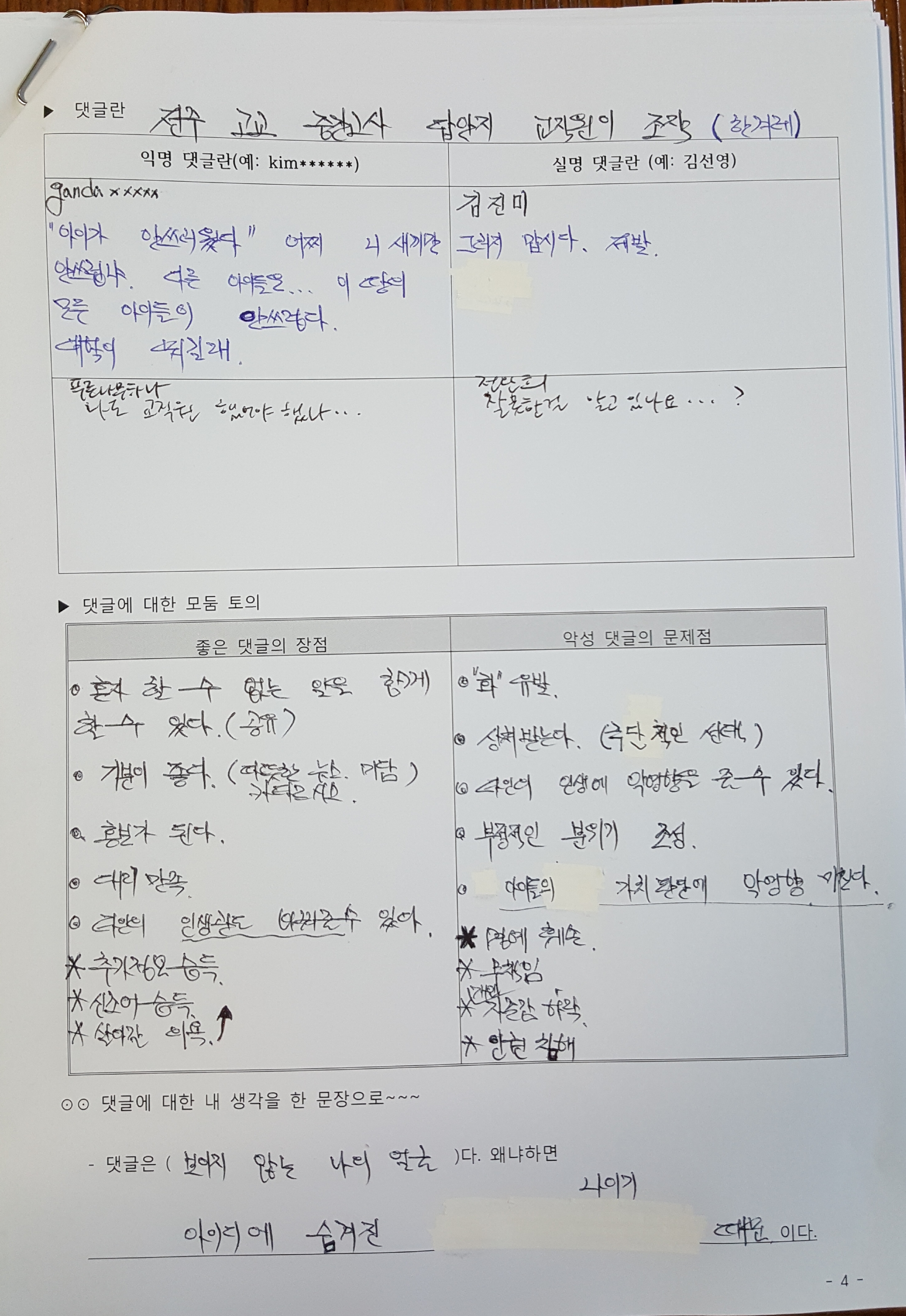기존의 댓글 중 답글을 쓰고 싶은 것을 골라 적어보라고 했다. 어떤 부모님은 걱정하는 목소리에는 공감의 답글을, 무작정 탓하는 목소리에는 일침을 놓기도 했다. 이런 댓글을 내 자녀가 본다면 어떨까 걱정된다고 했다. 이번에는 학부모님이 직접 댓글이 달릴 만한 기사를 골라보기로 했다. 댓글은 익명과 실명 두 가지 방법으로 썼다. 참가자들은 댓글 쓰기 내용을 발표하면서, “익명의 보장이 사람을 더 대담하게 책임감 없이 글을 쓰게 한다는 것을 실감한다”, “아이들과 댓글을 읽으며 이야기를 나누어 봐야겠다”고 말했다.