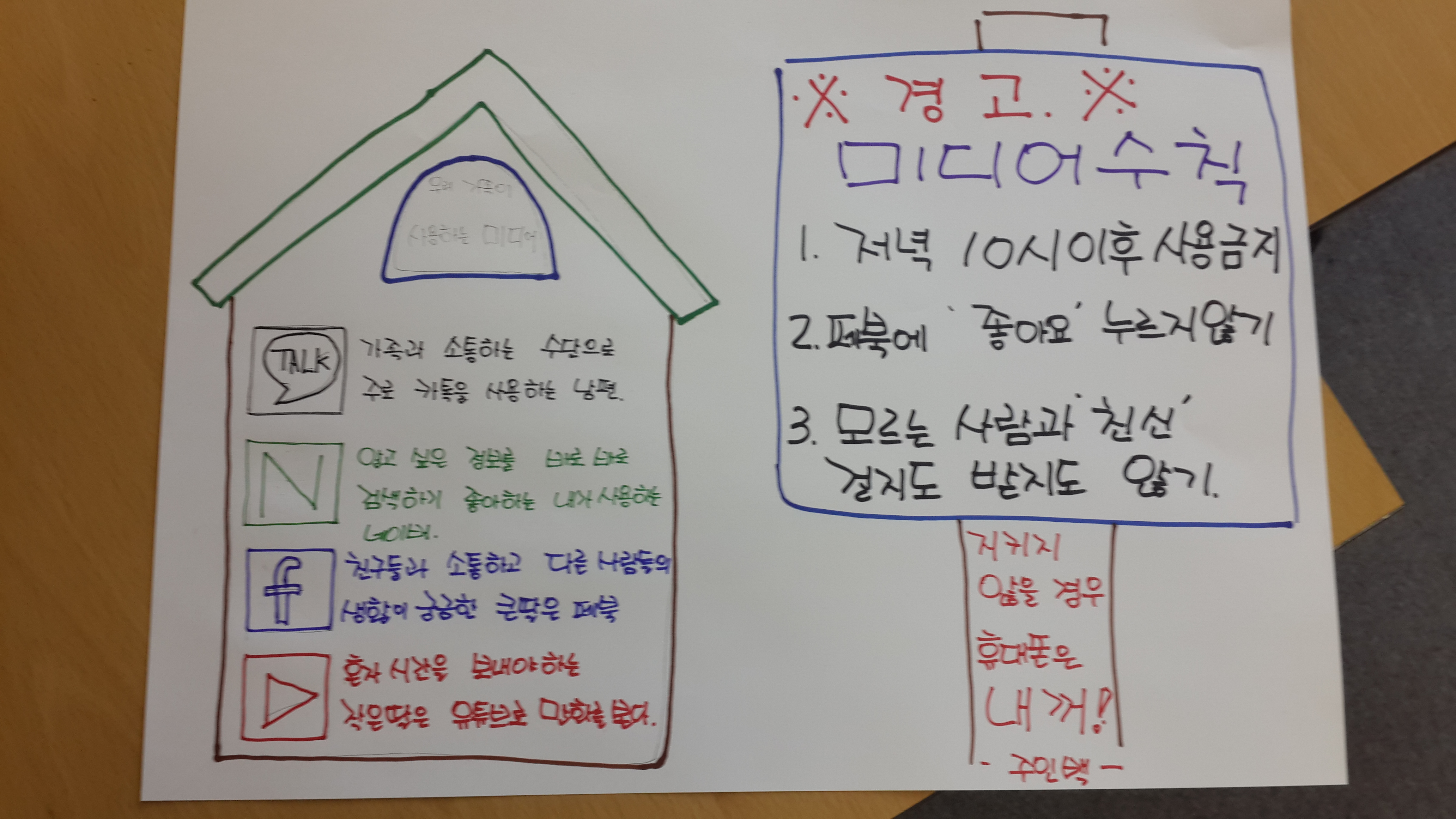 부모님들은 필요한 정보를 얻기 위해 어떤 미디어를 이용하는지 궁금했다. 인터넷(네이버, 유튜브, 밴드), 책, 신문, 스마트폰, TV 등 부모님들의 대답은 다양했다. ‘나를 닮은 미디어는 무엇일까?’ 질문한 뒤, 미디어를 선택하고 이유를 찾아보게 했다. 자신이 페이스북을 닮았다는 한 참가자는 “뜬금없고 새로운 것”, “짧고 얇게 아는 것”이 닮았다고 한다. 그리고 금방 그 흥미가 사라지는 것도 닮았다며 웃는다. 이어서 즐겨 찾는 미디어는 무엇인지, 그 미디어를 즐겨 사용하는 이유는 무엇인지 생각해보았다. 평소에 내가 즐겨 사용하는 게 뭐였지? 이것저것 많다는 대답도 있었고, 딱히 생각나는 건 없지만 스마트폰 정도라는 반응도 돌아왔다.