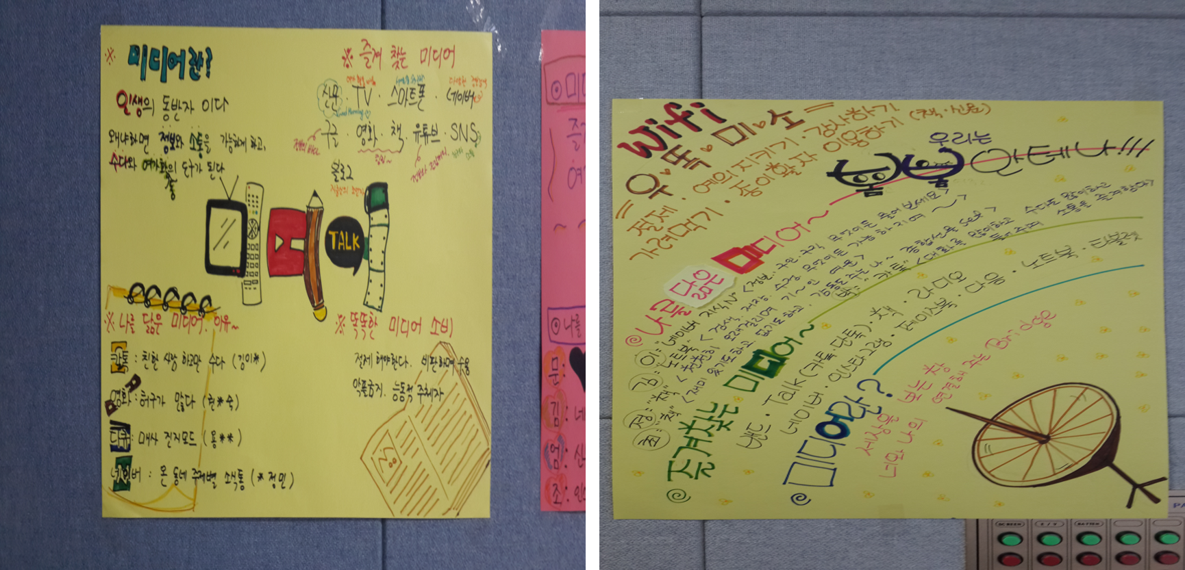 짝꿍과 내용 나누기를 하고, 서로 소개한 것 중 하나를 선택하게 했다. 미디어의 장점과 단점, 올바르게 사용하는 방법을 찾아보았다. 카톡을 선택한 팀에서는 장점으로 ‘소통이 잘된다’, ‘전달이 빠르다’, ‘은행 업무도 가능하다’를, 단점으로는 ‘원하지 않는 정보에 노출된다’, ‘내 의사와 상관없이 단톡방에 강제 초대된다’, ‘보이스피싱에 유출되기 쉽다’ 등을 꼽았다. 카톡을 올바르게 사용하기 위해서는 ‘필요한 경우에만 이용한다’, ‘사람들이 많은 곳에서는 무음으로 설정한다’, ‘잠자리에 들 때는 메시지를 확인하지 않는다’ 등의 의견이 나왔다.