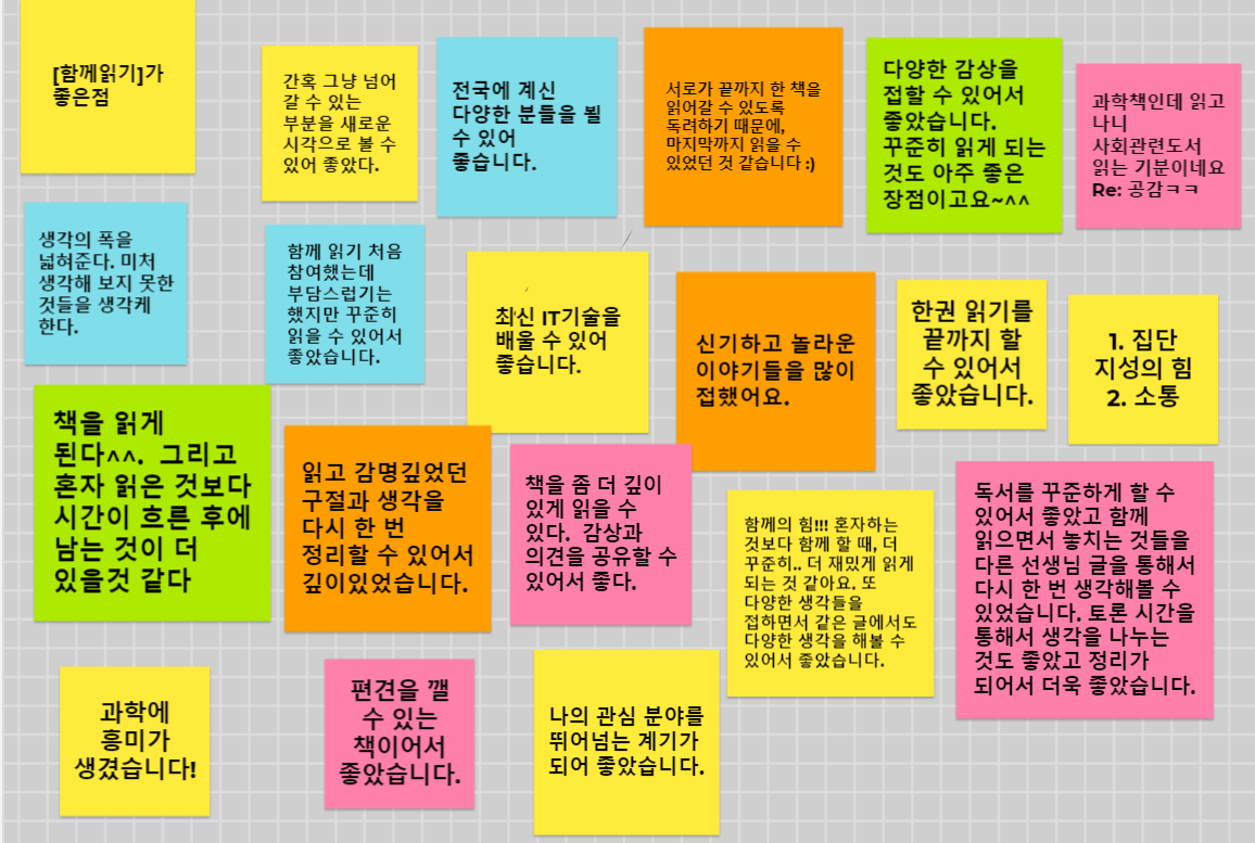 ‘함께읽기’가 함께 읽은 첫 책 《뉴스를 보는 눈》에 나오는 “한 사회는 구성원이 서로 공유하는 생각과 가치 체계 덕분에 유지됩니다”라는 문장처럼 우리는 사회가 지향해야 할 가치와 비전에 대해 이야기 나누며 그 어떤 모임에서도 느낄 수 없었던 유대감을 갖게 됐다.