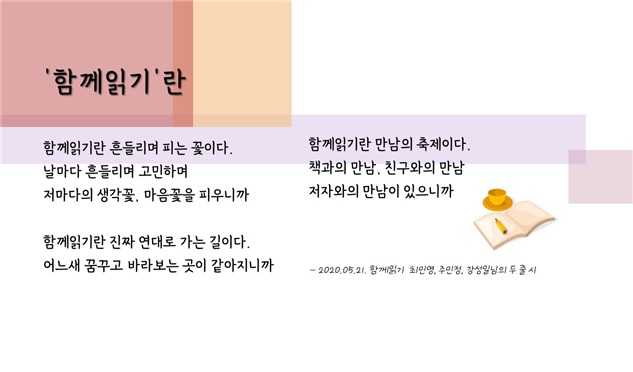 둘째, 각자 한 권의 책을 읽고 만나는 독후 모임과 달리 ‘함께읽기’는 매일매일 읽는 분량을 나누어 함께 읽고 이야기를 나누기 때문에 책 읽는 호흡을 함께하며, 두꺼운 책도 혼자 읽을 때보다 깊이 있게 의미를 찾아 읽을 수 있다. 바쁜 일상에서도 부담 없이 어느새 자기도 모르게 책 한 권을 완독할 수 있다.