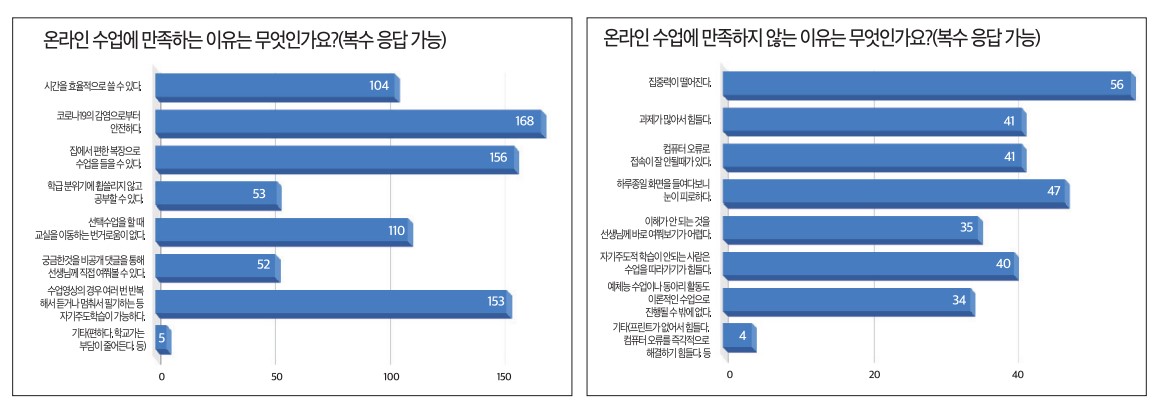 온라인 수업에 대해 학생들은 어떻게 생각할까? 본교 1, 2학년을 대상으로 자체적으로 실시한 온라인 수업 만족도 조사는 유의미한 결과를 나타냈다. 온라인 수업에 대해 ‘만족한다’ 75.2%, ‘만족하지 않는다’ 24.8%로 만족한다는 의견이 더 많았다. 만족하는 이유 중 첫 번째로 손꼽힌 것은 ‘코로나19의 감염으로부터 안전하다’였다. 이것은 코로나19로부터 안전을 확보하기 위해 마련된 온라인 수업의 목적에 부합되는 결과였다. 그 다음으로 ‘집에서 편한 복장으로 수업을 들을 수 있다’, ‘수업 영상의 경우 여러 번 반복해서 듣거나 멈춰서 필기하는 등 자기주도학습이 가능하다’, ‘선택 수업을 할 때 교실을 이동하는 번거로움이 없다’, ‘시간을 효율적으로 쓸 수 있다’, ‘학급 분위기에 휩쓸리지 않고 공부할 수 있다’, ‘궁금한 것을 비공개 댓글을 통해 선생님께 직접 여쭤볼 수 있다’ 순으로 만족하는 이유가 집계됐다. 독립적인 공간에서 자기주도적 학습에 어려움을 느끼지 않는 아이들은 대체로 온라인 수업에 만족하는 것으로 보인다.