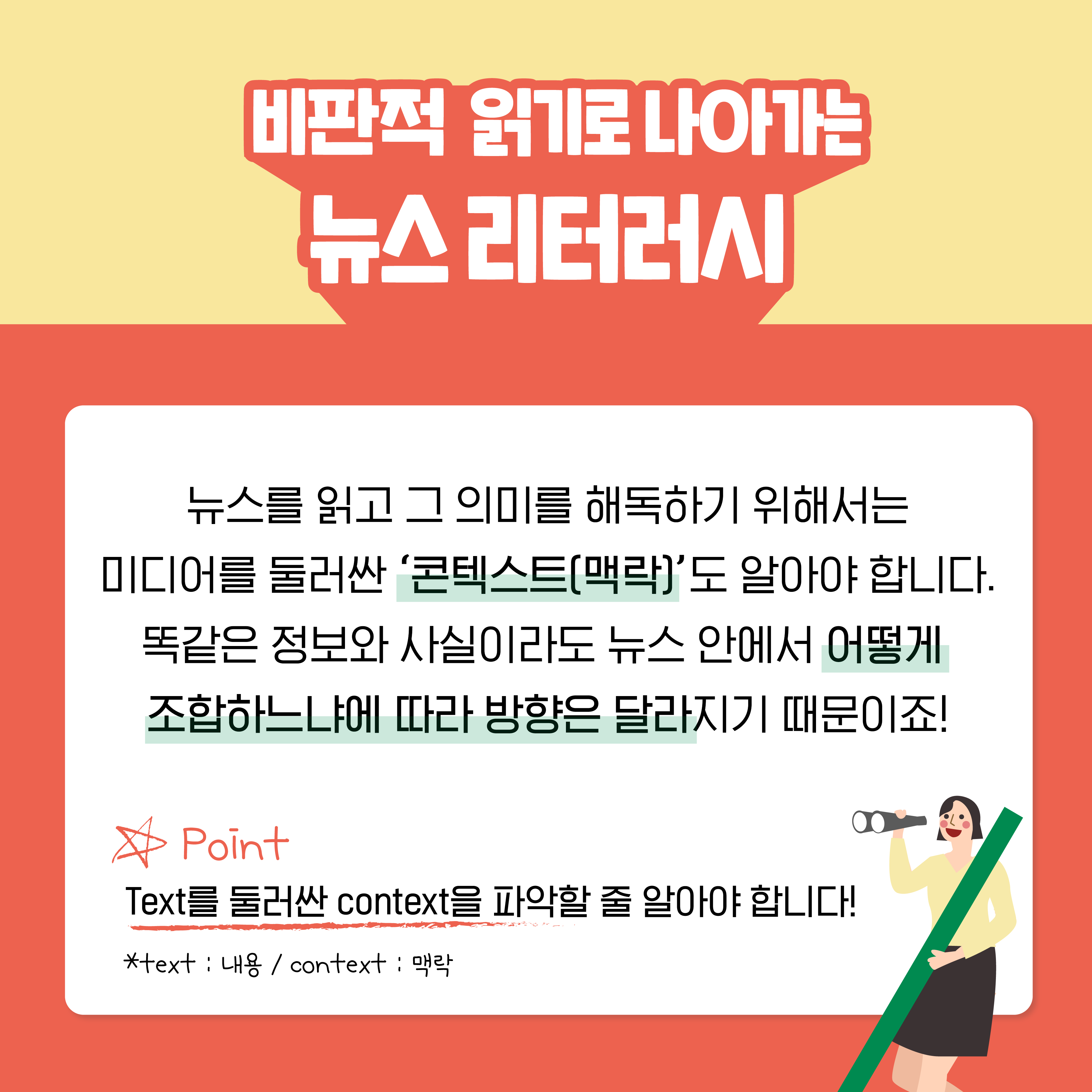 단순히 텍스트를 읽는 것이 아닌 뉴스를 둘러싼 콘텍스트, 즉 맥락을 파악할 수 있어야 합니다.