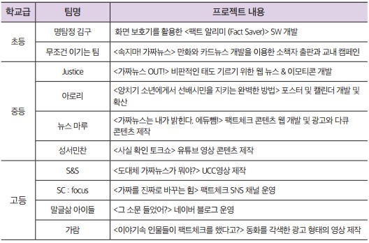또한 예선 과제와 함께 프로젝트 계획서를 제출하도록 했다. 계획서에는 코로나19와 관련해 많은 가짜뉴스가 생산 유포되고 있는 상황에서 우리 사회를 가짜뉴스로부터 보호하기 위한 내용을 담아야 한다. 본선 진출팀의 프로젝트 계획의 내용을 간략히 소개하면 [표4]와 같다.