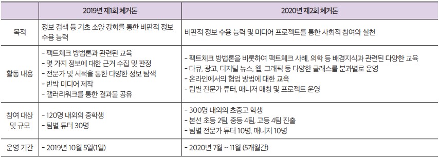 지난해 개최된 제1회 체커톤1)은 학생들이 하루 동안 특정 공간에 모여 집중적으로 문제를 해결하는 과정으로 진행됐다. 학생들이 몇 가지 정보와 관련된 사실을 찾아보고 이를 통해 판정을 내리는 ‘팩트체크’ 중심이었다. 팩트체크를 주제로 한 대규모 미디어교육 행사로서 첫발을 떼었다는 점에서 1회 대회는 의미가 있었지만 대부분의 예산이 행사 운영에 필요한 소모성 경비로 투입됐다는 점에서 아쉬움이 있었다. 또한 미디어나 정보에 대한 비판적 분석을 넘어 사회적 실천이나 참여로 나아가지 못한 부분은 한계로 남았다.