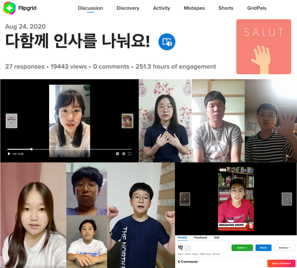 (좌) 플립그리드를 이용한 자기소개 미션 / (우) 체커톤 협업을 위한 플랫폼 MS팀즈 화면 <사진 출처 : 필자 제공>