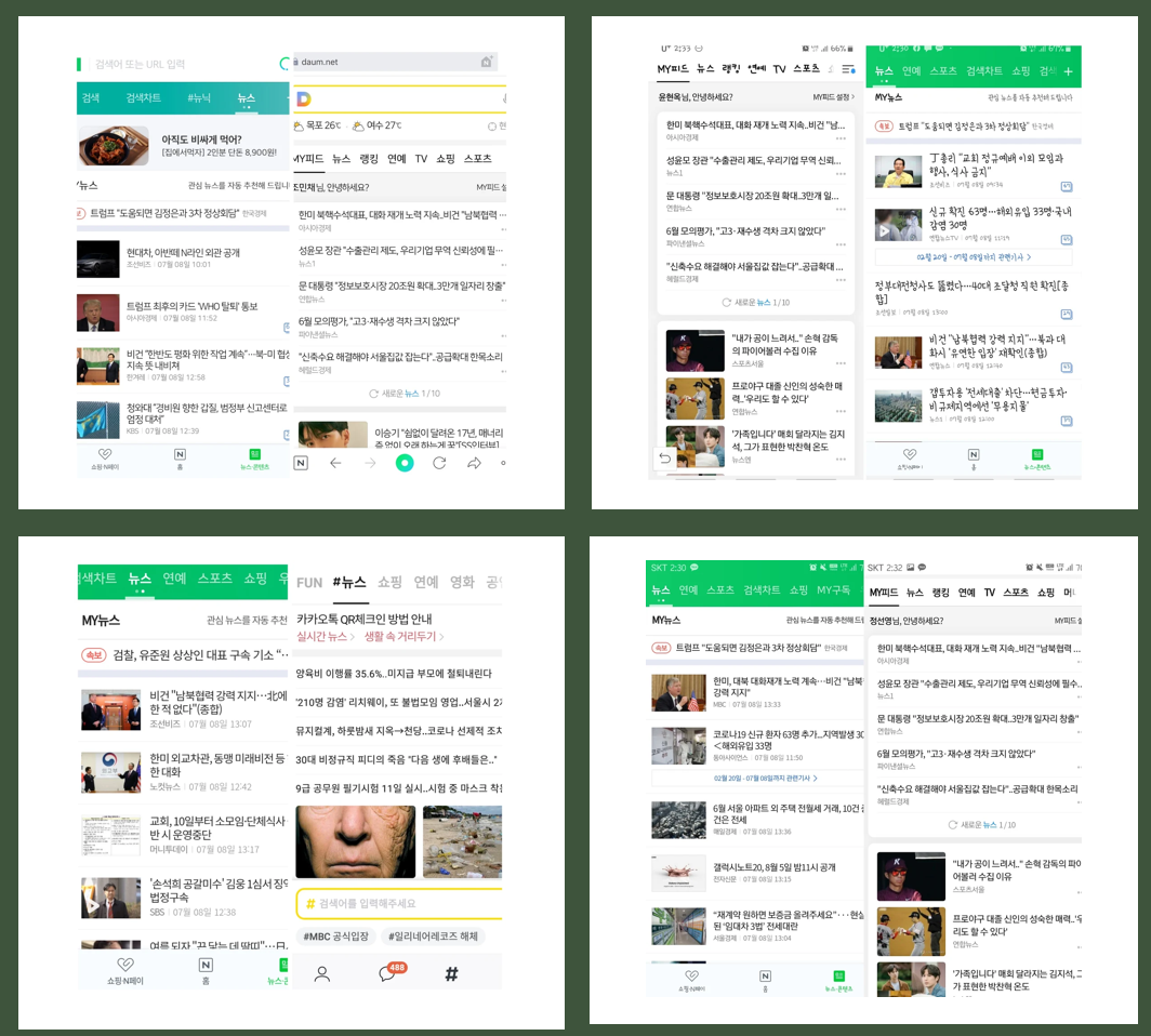 그동안 인공지능 알고리즘이 선별해서 보여주는 뉴스를 일방적으로 소비했다면 뉴스 배열이 공정한가, 나에게 진짜 필요한 뉴스인가에 대한 질문은 잠시 미뤄두고 개인 스마트폰 속 포털 메인 뉴스는 어떻게 보이는지 두 포털의 뉴스를 비교해 본다. 네이버 알고리즘 에어스와 다음카카오 알고리즘 루빅스가 개인 뉴스피드에 어떤 뉴스를 추천해 보여주는지 확인해보기 위해서다. 네이버와 다음의 종합 뉴스와 개인 뉴스피드 화면에는 비슷한 뉴스가 추천됐지만 조금 다른 기사들도 추천되는 것을 볼 수 있었다. 이용자의 뉴스 선호도에 따라 유용하다고 판단되는 관심 정보를 제공받았는지 친구들끼리 비교해보면 서로에게 조금씩 다른 뉴스가 배치되고 있다는 사실을 확인할 수 있었다.