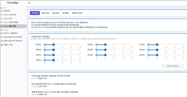 뉴스 샘플은 인포데믹, 환경오염, MZ세대, 퍼블리시티권 등을 주제로 클러스터링한 뉴스들이 높은 점수 순서대로 배열되어 있다. 각 기사를 클릭하면 계량 요인에 따른 상세 계산 과정을 확인할 수 있다. 특히 학생들이 주목한 것은 요인별 가중치 적용 패널을 통해 가치별 중요도를 직접 지정해서 배열이 어떻게 변하는지 확인할 수 있는 실습이었다. 학생들에게 친근한 주제의 기사 샘플 적용이 추가적으로 필요하다. 만약 학생들이 기사 읽기에 익숙하지 않을 경우 학급별 대상별에 맞는 뉴스 이해 수업이 먼저 선행되어야 프로그램을 좀 더 친숙하게 능동적으로 이용할 수 있을 것이다.