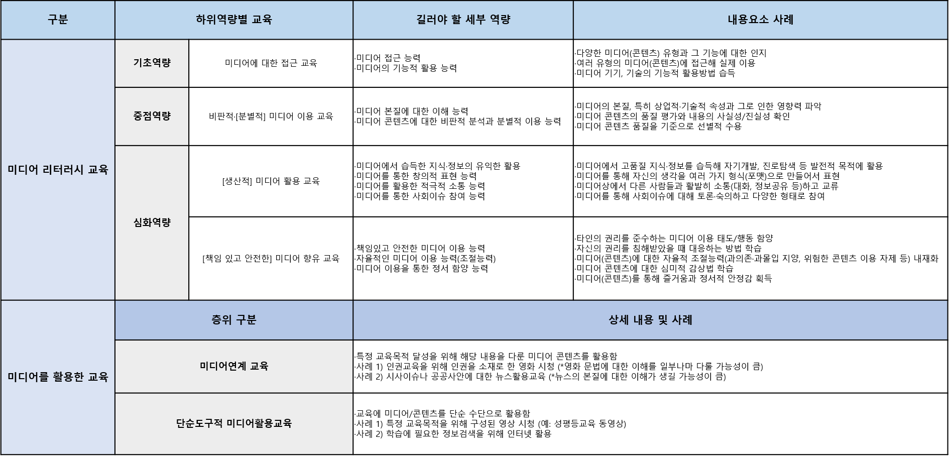 그동안 혼재되어 사용돼온 미디어 리터러시 교육과 미디어를 활용한 교육으로 층위를 구분하고 상세 내용과 사례를 통해 개념을 명확히 했다. 또한 미디어 리터러시 교육의 하위 역량을 미디어에 대한 접근 교육, 비판적·[분별적] 미디어 이용 교육, [생산적] 미디어 활용 교육, [책임 있고 안전한] 미디어 향유 교육으로 구분하고 길러야 할 세부 역량과 내용 요소 사례를 제시하고 해설함으로써 미디어교육의 재구조화와 더불어 교통정리를 꾀하고 있다. [표1]에 제시된 점선의 의미는 하위 역량 간에 서로 엄격한 분리가 가능하기보다는 교집합적인 요소가 많다는 것을 드러낸 것이다. 또, [ ]의 의미는 이 수식어들이 오늘의 미디어교육이 추구해야 할 지향점인 동시에 다른 용어로 대체될 수 있다는 의미를 내포한다. 그동안 미디어교육이 무엇이고 어떤 영역으로 이루어져 있으며 핵심역량이 무엇인지 궁금했던 분들, 특히 특정 영역의 미디어교육만을 중점적으로 담당했던 분들은 이 장을 꼭 탐독하기를 권한다.
