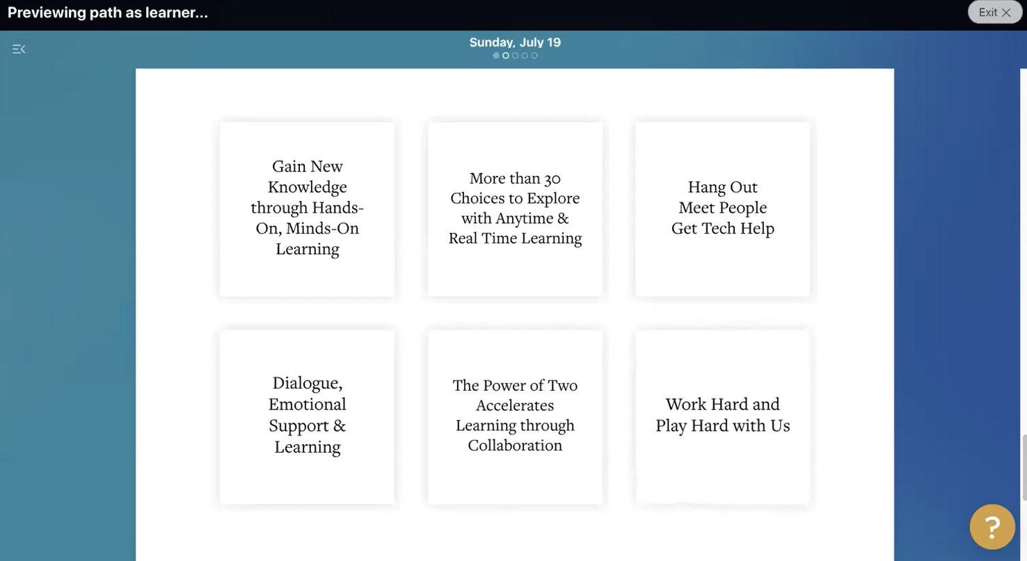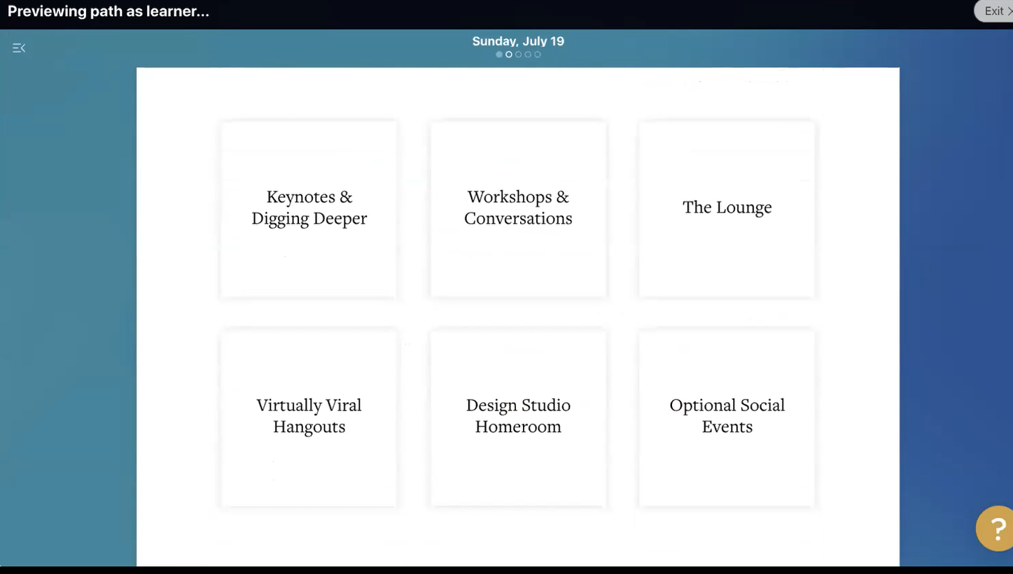 온라인 교육 플랫폼 패스라이트(Pathwright)에서 진행된 이번 연수는 기조연설, 35개의 워크숍, 그리고 디자인 스튜디오로 구성돼 있다. 참가자들은 연수 첫날 패스라이트 사용법과 앞으로의 일정에 관해 설명을 듣는다. 사진2에서 볼 수 있듯이 각 항목을 클릭해 들어갈 수 있는데, 패스라이트나 줌(Zoom) 사용 중에 어려움이 있으면 언제든지 ‘라운지(The Lounge)’를 클릭해 다른 사람의 도움을 받을 수 있다. 라운지에는 기술적인 문제를 비롯, 연수 참가자에게 발생한 어떤 어려움도 상의하고 도움을 줄 수 있는 누군가가 항시 대기하고 있다.