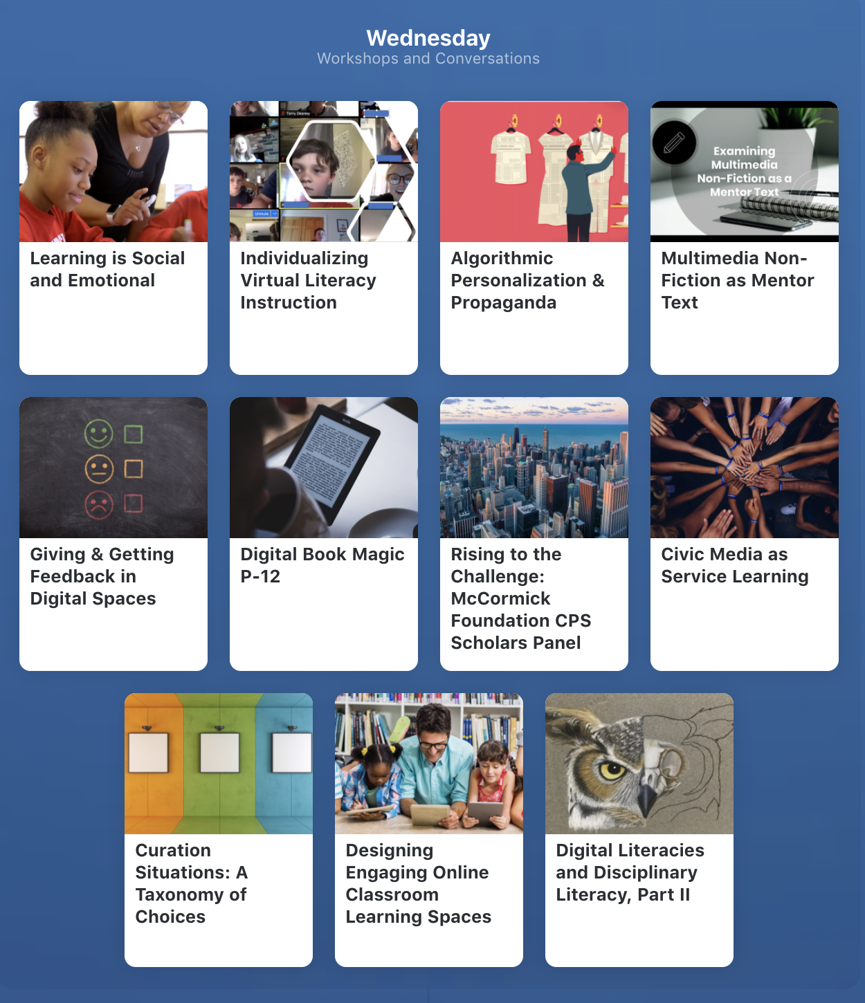 또한 참가자들은 35개 주제로 구성된 개별 워크숍 가운데 개인이 참가하고 싶은 세션에 들어간다. 워크숍 주제는 ‘다시 생각해보는 디지털 리터러시 교실 안에서의 배움’, ‘어린이 미디어 분석’, ‘이미지를 통한 역사적 관점 세우기’, ‘온라인상에서 소풍가기’, ‘실제 삶에서 사용할 수 있는 토론과 논쟁 가르치기’, ‘매거진 리터러시’, ‘원격 수업에서 협동할 수 있는 도구와 실천 사례’, ‘창조적 비디오 제작 수업’, ‘음모론과 문화 전쟁’, ‘대학에서의 온라인 수업’, ‘스크린 캐스트 애플리케이션을 사용한 수업’, ‘디지털 공간에서 피드백 주고받기’, ‘유치원에서 고등학교까지, 디지털 책의 마법’, ‘교육 안에서의 디지털 불평등’, ‘학생들의 자기 주도적 학습 독려 방법’, ‘COVID-19으로 인한 원격 수업에서 배운 것들’, ‘문화와 교실을 연결하는 가족 리터러시’ 등이다.