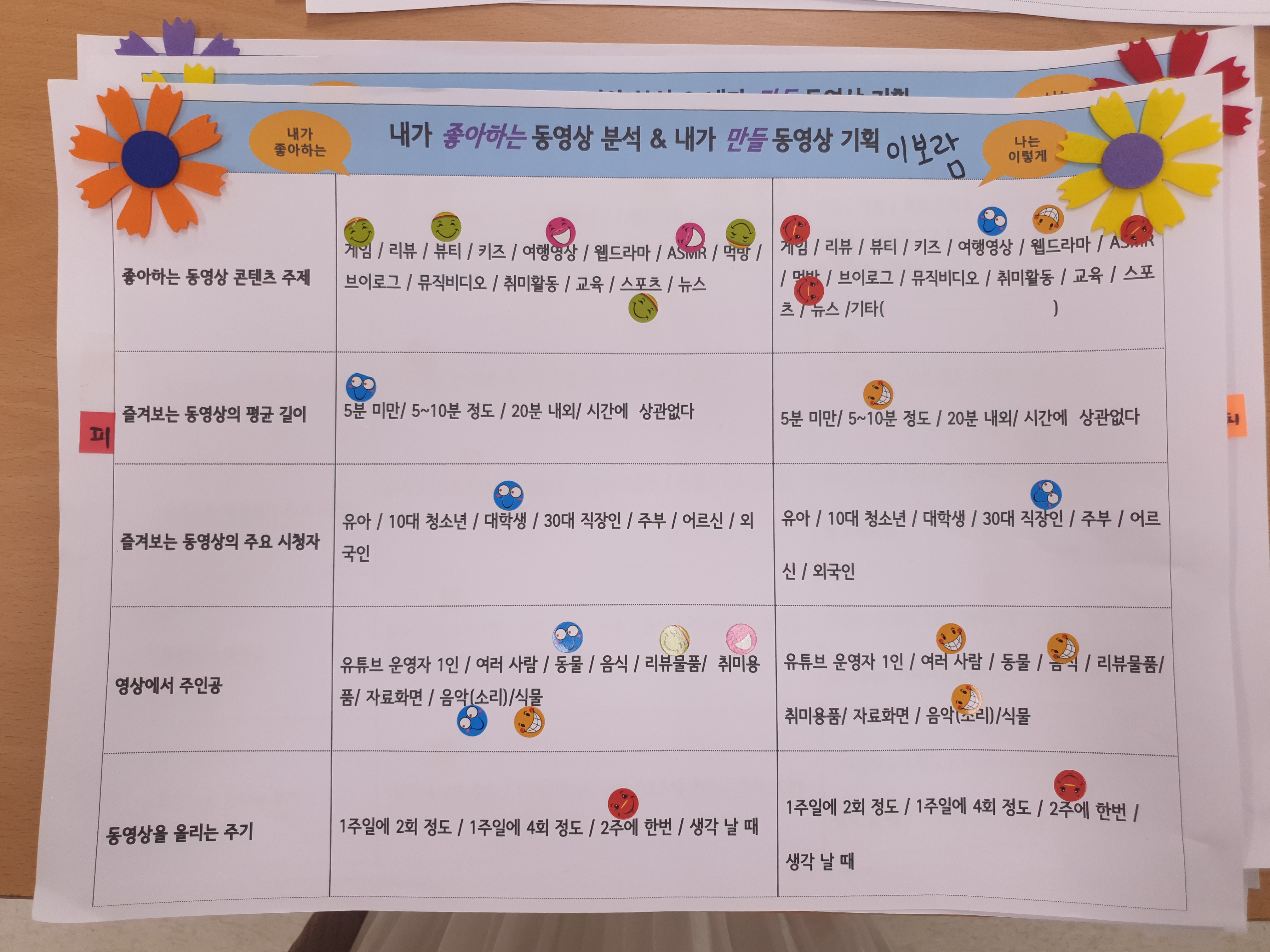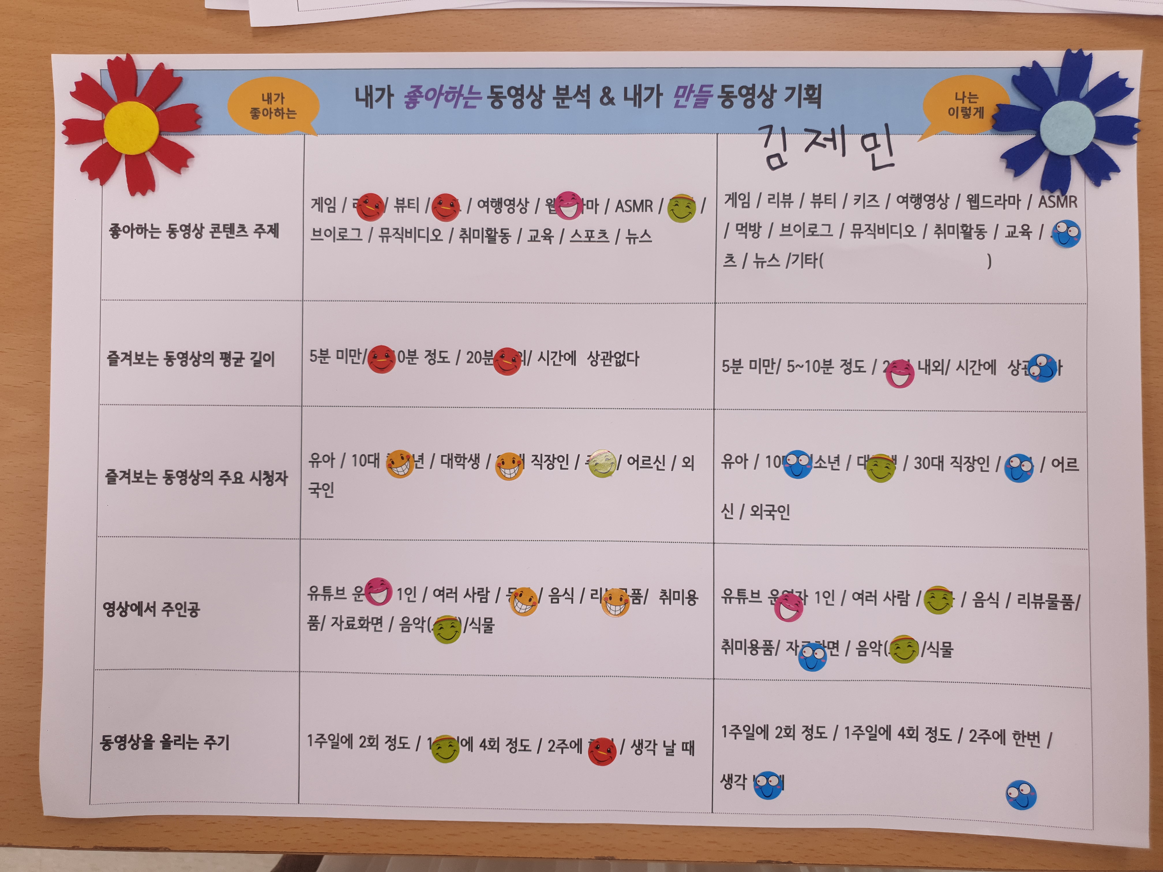 모두 열성적으로 유튜브를 소비하고 있었다. 하루 평균 5~10분 정도 유튜브를 시청하고 있었지만, 때론 시간에 상관없이 좋아하는 콘텐츠를 하루 종일 시청할 수도 있다고 말하는 이도 있었다. 이어서 활동지를 나누어주었다. 활동지에는 지금까지 나눈 대화를 기준으로 ‘내가 좋아하는 동영상 분석’란에 스티커를 붙이도록 했다. 교육생의 연령대가 다양한 만큼 각자의 취향에 따른 선호도 역시 다양하게 나왔다.