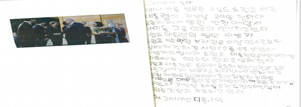 오늘 아이들이 먼저 뉴스 이야기를 꺼낸다. 이제 뉴스일기 쓰기가 석 달이 넘어가니 뉴스가 먼 나라의 이야기로 들리지 않나보다. 오히려 뉴스로 나와 생각을 나누고 이 상황이 왜 그런지 물어본다. 처음에는 어려워했지만 뉴스를 ‘우리가 사는 세상 이야기’로 생각하게 돼서 다행이다. 오늘의 뉴스는 트럼프 미국 대통령이 우리나라를 방문한 것이었다. “트럼프가 엑소를 만나다”라는 제목의 뉴스였는데 트럼프 대통령이 우리나라를 방문한 이유에 대해 설명을 많이 했다. 아이들에게는 엑소에 대한 관심과 할 말이 많은 하루였다. 아이들에게 지금까지는 뉴스에 대한 사실을 써보았으니 이제부터 이 뉴스가 세상에 좋게 영향을 미치는 점, 안 좋은 영향을 미치는 점에 대해 생각해보고 뉴스일기에 써보면 좋겠다고 말해주었다. 박도담 학생이 “왜 뉴스일기를 쓰는지 모르겠다. 너무 힘들다. 안 하고 싶다”라고 의견을 냈다. “전국적인 대회인데 우리가 (상을) 받을 가능성도 없지 않느냐?”고 질문한다. 뉴스일기를 쓰면 좋은 이유, 공부는 책만으로 배우는 것이 아니다 등의 이야기를 해주었다.