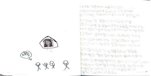 선생님과 헤어질 시간이 다가온다. 선생님한테 너무 많이 따졌던 것 같다. 선생님이 여자 아이들한테만 심부름시키고 활동을 하면 여자 아이들만 잘한다고 하는 것 같아서 화가 났었다. 뉴스읽기도 처음에는 그런 것 같아서 짜증이 많이 났었다. 며칠 전 선생님이 내 뉴스일기를 보고 “글씨 이쁘다. 내용도 괜찮은데…”라고 하셨다. 생각이나 너만의 관점 말고 다른 사람의 관점도 찾는 행동이 있었으면 좋겠다고 하셨지만 난 선생님의 칭찬이 더 좋았다. 뉴스일기 쓰기 활동을 통해서 선생님과 많이 이야기할 수 있어서 좋았다.