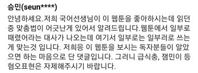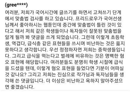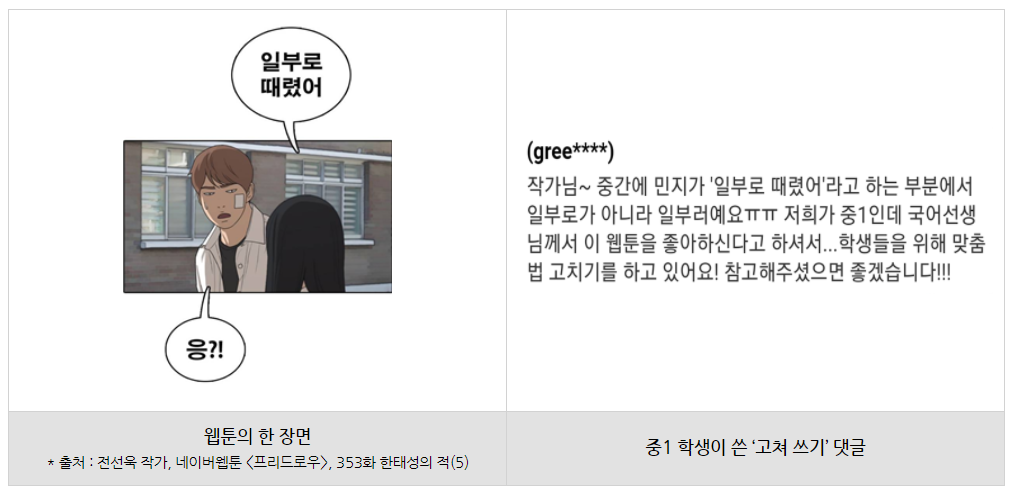 중학교 1학년 국어 글쓰기 단원에서 ‘고쳐 쓰기’를 주제로 실시간 원격 수업을 하던 중이었습니다. 온라인 맞춤법 검사기를 사용하는 방법, 맞춤법 오류 사례 등을 소개하며 청소년들이 즐겨보는 웹툰의 한 장면을 인용했습니다. 그리고 저는 “이 맞춤법 오류를 바로 잡기 위해 우리가 직접 댓글을 달자”고 제안했습니다. 학생들은 웹툰에 다음과 같은 댓글을 남겼습니다.