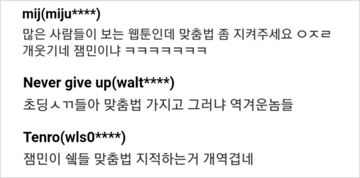 중학교 1학년 국어 글쓰기 단원에서 ‘고쳐 쓰기’를 주제로 실시간 원격 수업을 하던 중이었습니다. 온라인 맞춤법 검사기를 사용하는 방법, 맞춤법 오류 사례 등을 소개하며 청소년들이 즐겨보는 웹툰의 한 장면을 인용했습니다. 그리고 저는 “이 맞춤법 오류를 바로 잡기 위해 우리가 직접 댓글을 달자”고 제안했습니다. 학생들은 웹툰에 다음과 같은 댓글을 남겼습니다.