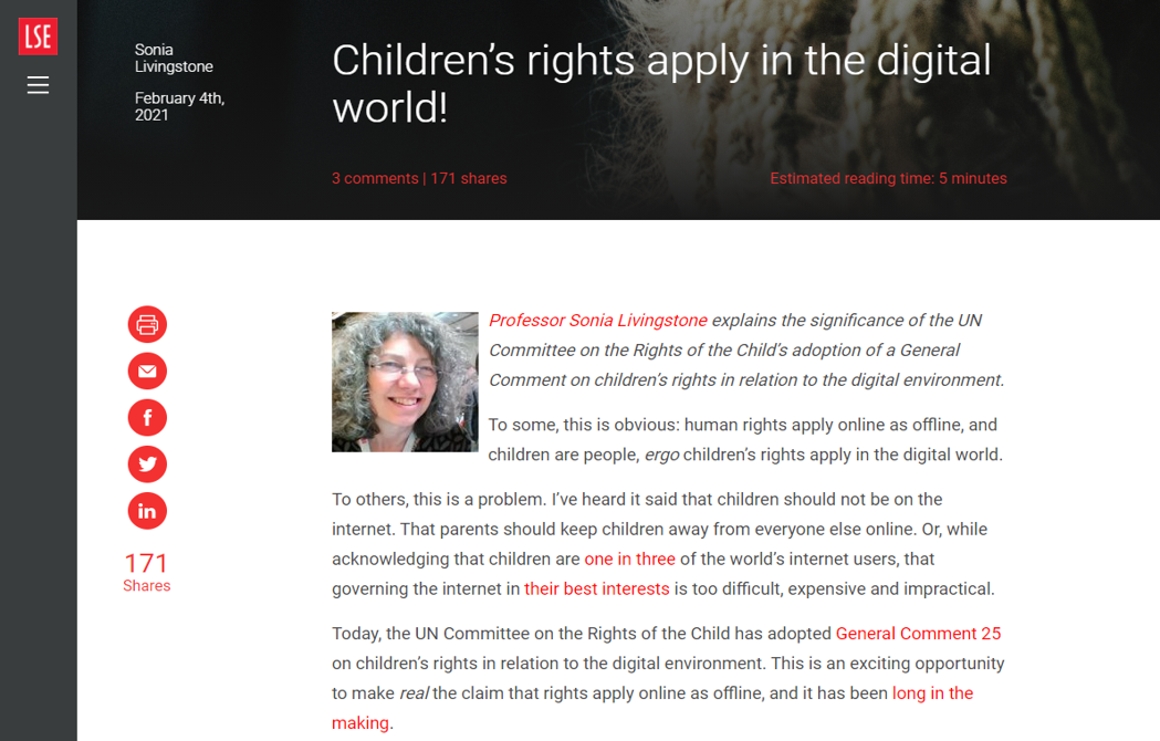미디어 리터러시와 디지털 리터러시 분야의 전문가로서, 일반 논평 제25호 관련 자문 그룹에서 활동한 영국 런던정경대의 소니아 리빙스턴 교수는 유엔 아동권리위원회의 일반 논평 제25호 채택을 축하하며 그 의미를 설명했다. 즉, 이번 논평은 실제 세상뿐 아니라 온라인 세상에서도 어린이의 권리를 보호하고 옹호하기 위한 실제적인 조치로서, 어린이의 시민권, 자유, 개인 정보에 관한 권리, 차별받지 않을 권리, 보호, 교육, 놀이 등에 관한 권리를 보장하기 위해 디지털 환경이 어떻게 조성되어야 하는지를 국제 사회에 명확히 제시했다는 점에 의의가 있다. 또한 리빙스턴 교수는 각 국가와 책임 있는 기관들이 이 문제에 관해 왜, 그리고 어떻게 행동해야 하는지를 분명히 설명하고 있다는 점을 높이 평가했다.