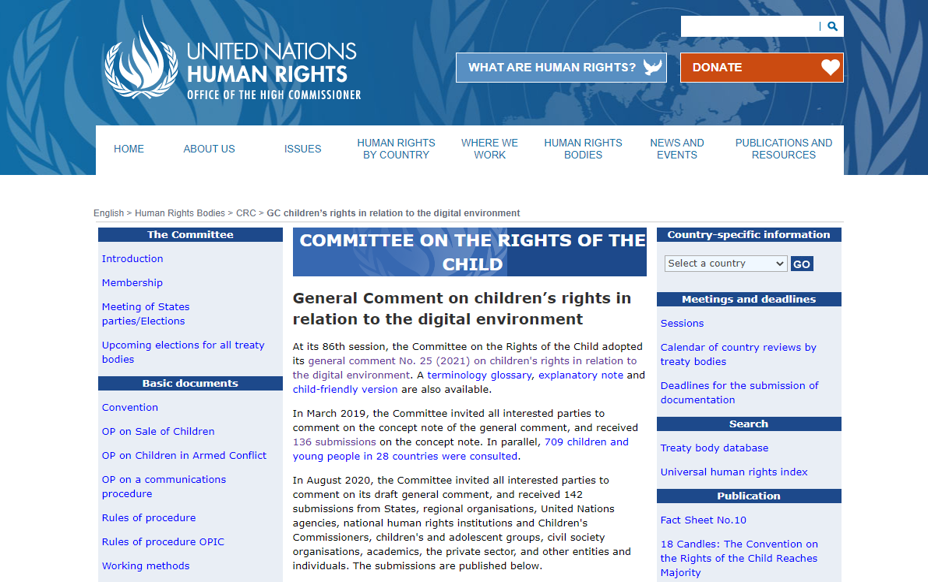 유엔의 일반 논평은 국제 조약이나 실행 계획안을 각 국가에서 해석하고 적용할 수 있도록 제공하는 가이드라인이다. 최근에 유엔 아동권리위원회가 채택한 일반 논평 제25호는 기존의 유엔 아동권리협약이 디지털 환경에서 어떻게 이해되고 실행되어야 하는지에 대해 개관한 것으로, 디지털 산업의 규약 및 디자인 표준에서부터 디지털 리터러시, 데이터 보호, 학교의 기술 인프라 구조, 어린이의 온라인 안전에 이르기까지 다양한 쟁점을 다루고 있다.