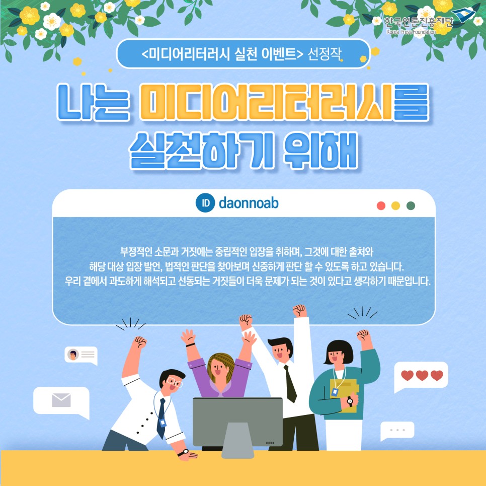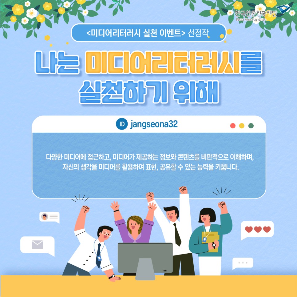 | 미디어리터러시 실천 이벤트! <나는 미디어리터러시를 실천하기 위해 ooo을 한다!> (0) | 2021.04.12 |