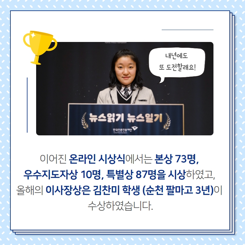 올해의 이사장상은 김찬미 학생 (순천 팔마고 3년)이 수상하였습니다.