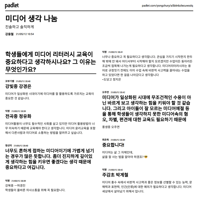 뉴스에서 미디어로 개념이 확장되었고 이미 구성되고 만들어진 강좌의 원격연수가 아닌, 실시간 쌍방향 연수였기 때문에 함께 호흡할 수 있는 생생한 강의였다. 실제 그런 소통을 잘 느낄 수 있는 강의였다. 중간중간에 섞으셨던 재치있는 답변이나 센스 있는 언변에서 연수를 듣는 다른 선생님들도 나도 웃음을 짓게 되는 강의였다. 무엇보다 물 흐르듯 강의를 진행하시는 모습이 인상적이었다. 강의내용은 주 PPT를 활용하여 전달하면서도 필요한 매체들은 채팅창을 활용하여 바로바로 활용할 수 있도록 제공해 주셨다. 모두 미디어 교육과 관련된 자료로서 교육매거진, 통계 자료(10대 청소년 미디어 이용 조사), 스토리텔링 콘텐츠(우리 아이의 미디어 습관), 미디어교육포털, 시청자미디어재단 등 유용한 사이트들을 소개해주셔서 앞으로도 유용하게 쓸 수 있게 되었다. 함께 강의를 들었던 선생님들의 생각들을 공유할 수 있고 질문에 답변해 주실 수 있도록 페들렛을 활용하여 소통한 점도 인상적이었다. 내가 학교에서 아이들과 소통하는 방법으로 함께 하니 익숙하고 좋았다.