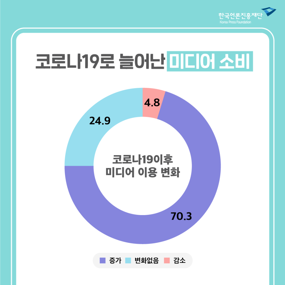 응답자의 70.3%가 코로나19 확산 이후 미디어 이용이 늘었다고 답변했습니다.