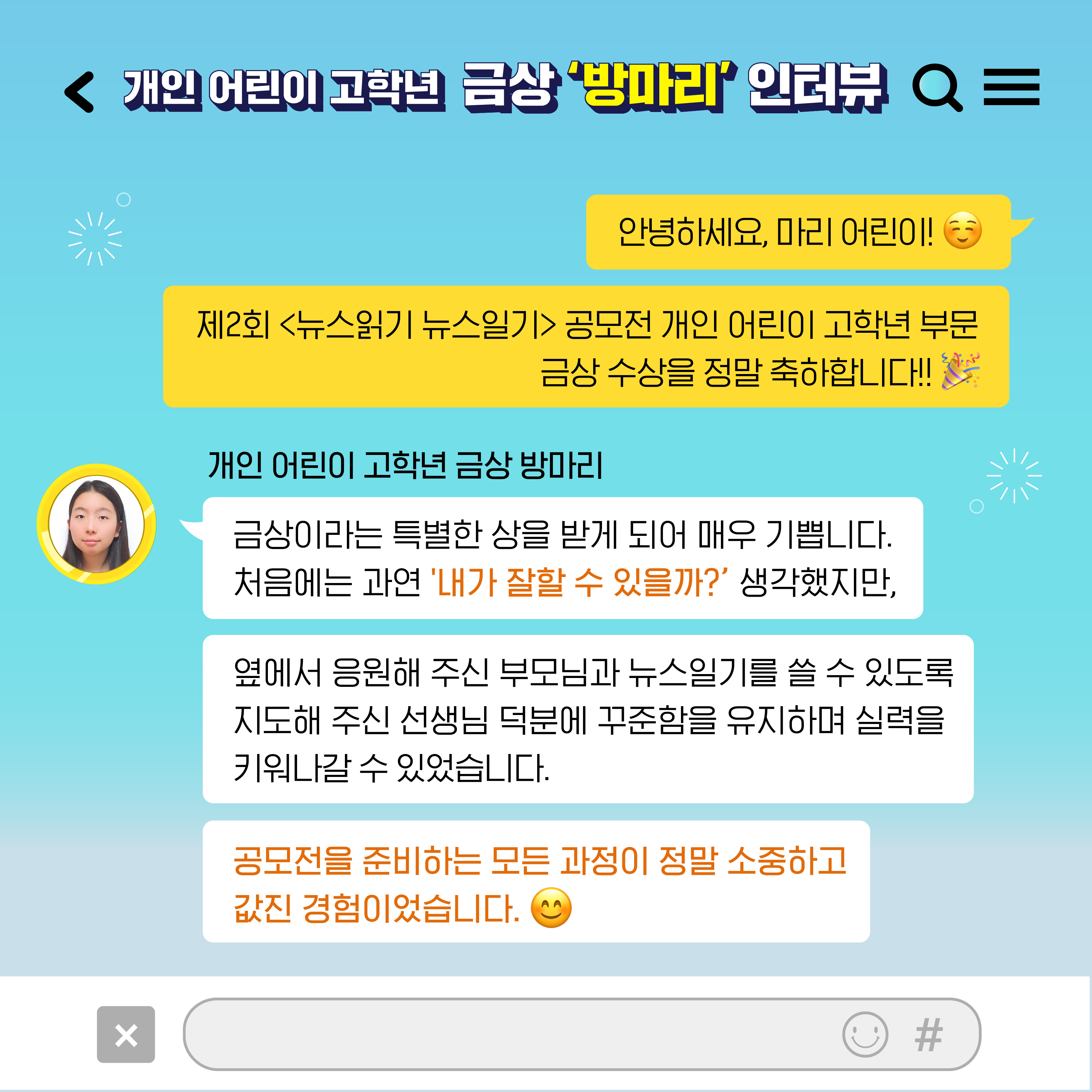 특히나 주목해야 할 제2회 공모전 개인 어린이 고학년 금상 방마리 어린이의 인터뷰입니다.